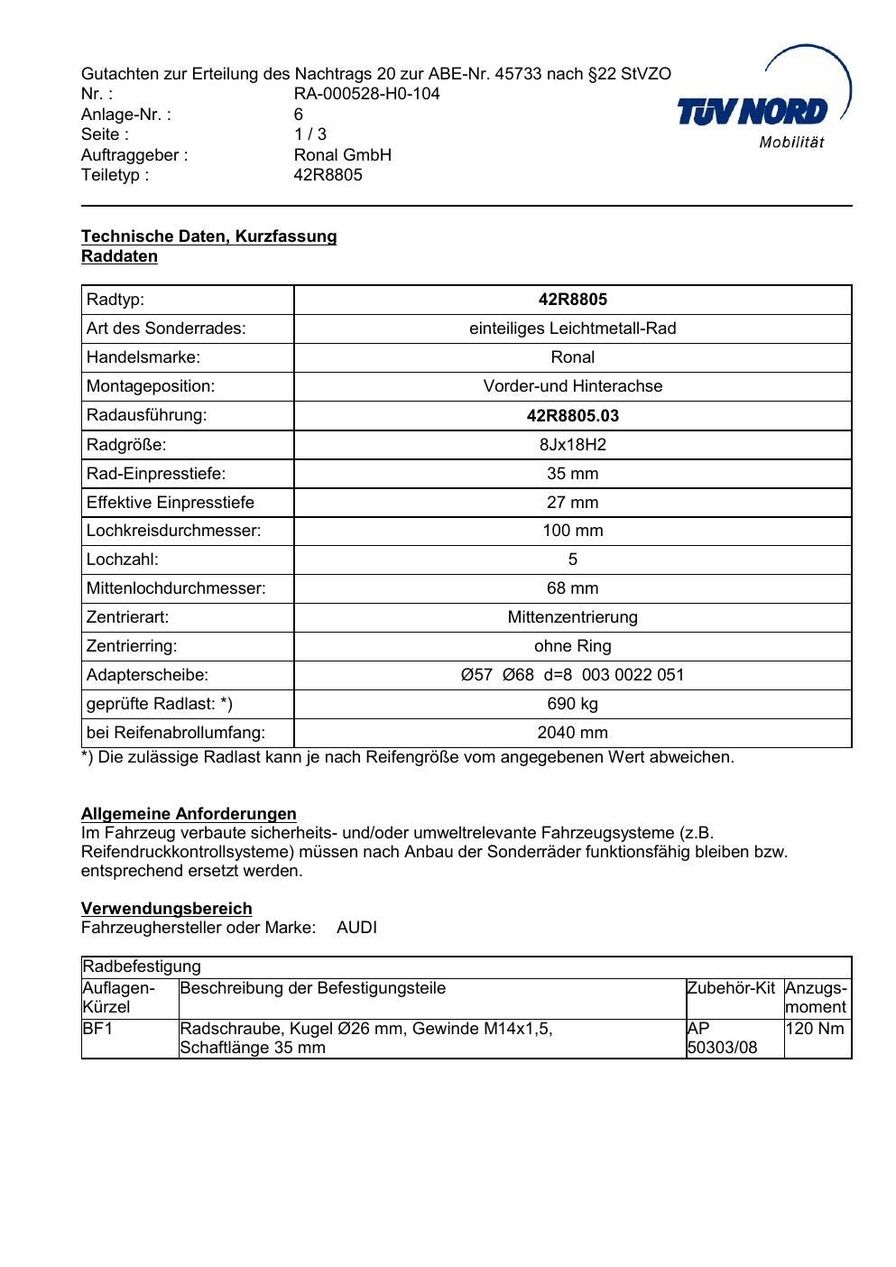 Dieses Gutachten (abe) bezieht sich auf die Alufelge brand-ronal 42R8805 in der Ausführung 8Jx18 ET 0, Mittenloch 0 mm (KBA 45733). Im PDF findest du typischerweise zulässige Reifengrößen, Auflagen/Anbauhinweise und – je nach Dokument – Hinweise zur Eintragung.