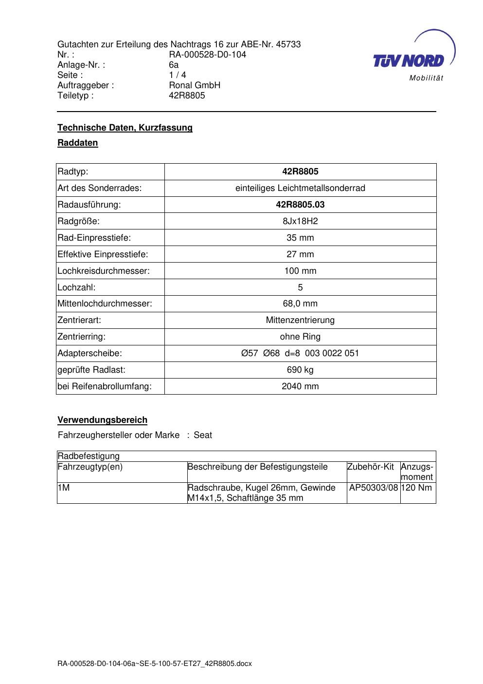 Dieses Gutachten (abe) bezieht sich auf die Alufelge brand-ronal 42R8805 in der Ausführung 8Jx18 ET 0, Mittenloch 0 mm (KBA 45733). Im PDF findest du typischerweise zulässige Reifengrößen, Auflagen/Anbauhinweise und – je nach Dokument – Hinweise zur Eintragung.