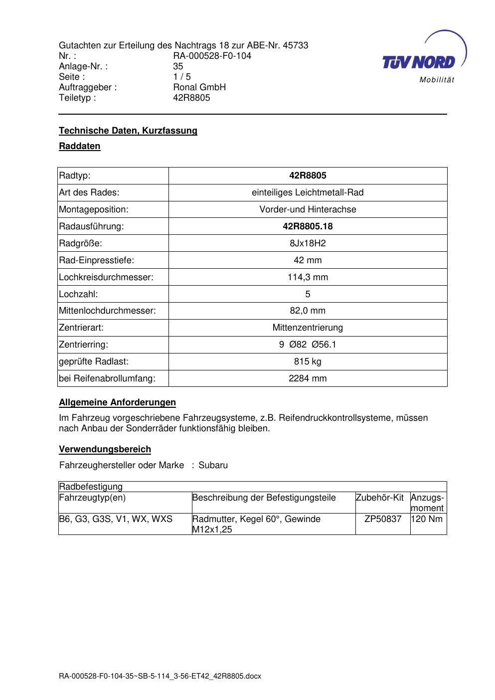 Dieses Gutachten (abe) bezieht sich auf die Alufelge brand-ronal 42R8805 in der Ausführung 8Jx18 ET 0, Mittenloch 0 mm (KBA 45733). Im PDF findest du typischerweise zulässige Reifengrößen, Auflagen/Anbauhinweise und – je nach Dokument – Hinweise zur Eintragung.