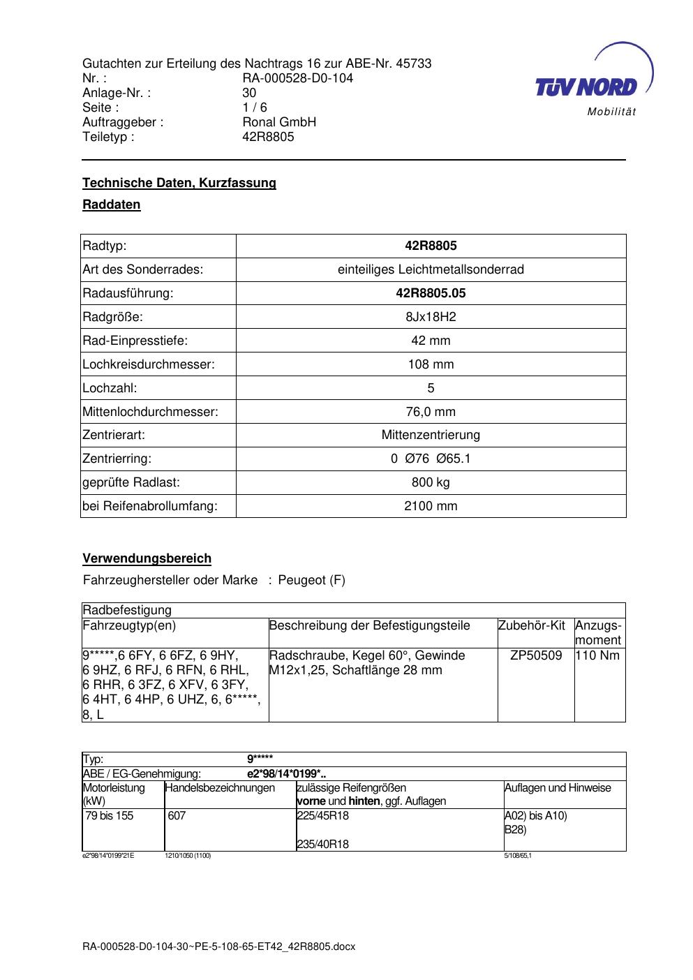 Dieses Gutachten (abe) bezieht sich auf die Alufelge brand-ronal 42R8805 in der Ausführung 8Jx18 ET 0, Mittenloch 0 mm (KBA 45733). Im PDF findest du typischerweise zulässige Reifengrößen, Auflagen/Anbauhinweise und – je nach Dokument – Hinweise zur Eintragung.