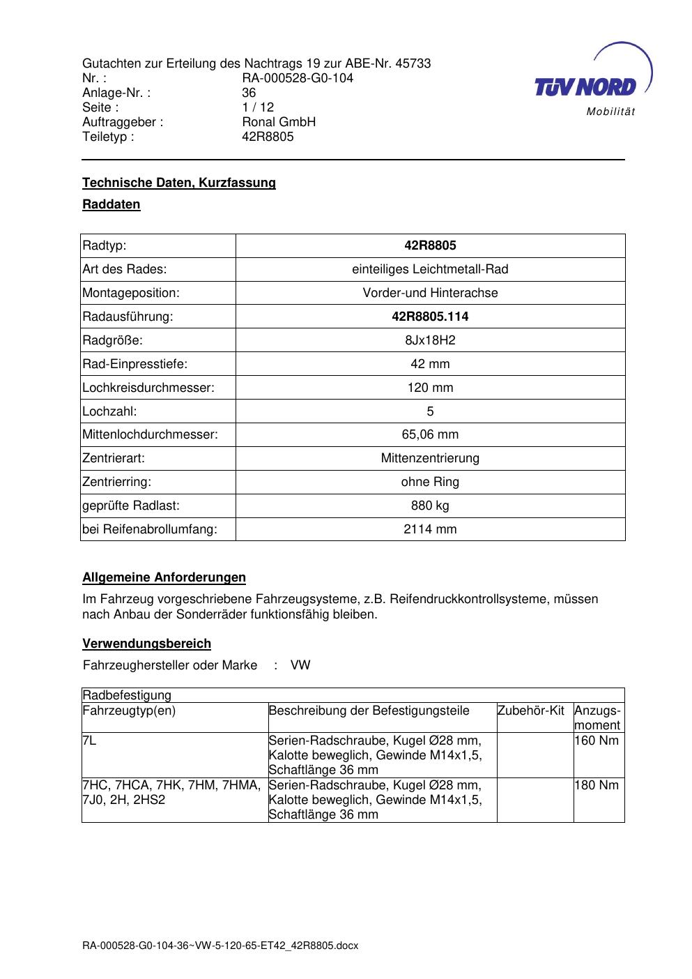 Dieses Gutachten (abe) bezieht sich auf die Alufelge brand-ronal 42R8805 in der Ausführung 8Jx18 ET 0, Mittenloch 0 mm (KBA 45733). Im PDF findest du typischerweise zulässige Reifengrößen, Auflagen/Anbauhinweise und – je nach Dokument – Hinweise zur Eintragung.