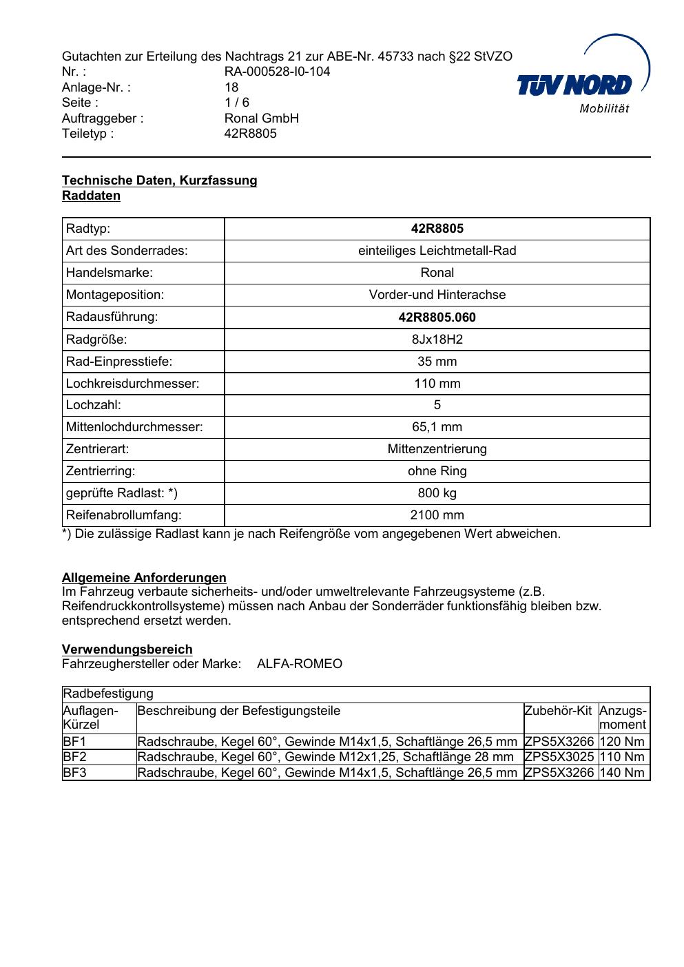 Dieses Gutachten (abe) bezieht sich auf die Alufelge brand-ronal 42R8805 in der Ausführung 8Jx18 ET 0, Mittenloch 0 mm (KBA 45733). Im PDF findest du typischerweise zulässige Reifengrößen, Auflagen/Anbauhinweise und – je nach Dokument – Hinweise zur Eintragung.