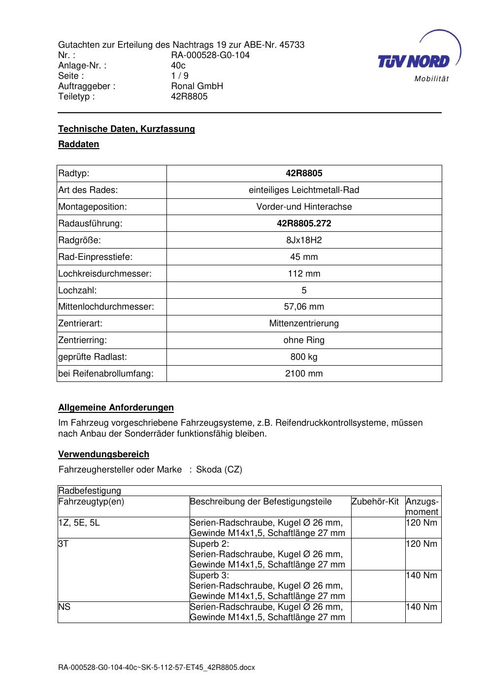 Dieses Gutachten (abe) bezieht sich auf die Alufelge brand-ronal 42R8805 in der Ausführung 8Jx18 ET 0, Mittenloch 0 mm (KBA 45733). Im PDF findest du typischerweise zulässige Reifengrößen, Auflagen/Anbauhinweise und – je nach Dokument – Hinweise zur Eintragung.