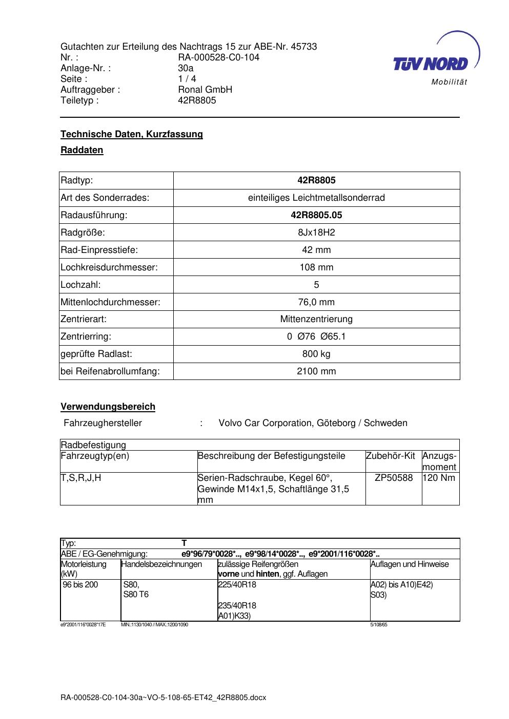 Dieses Gutachten (abe) bezieht sich auf die Alufelge brand-ronal 42R8805 in der Ausführung 8Jx18 ET 0, Mittenloch 0 mm (KBA 45733). Im PDF findest du typischerweise zulässige Reifengrößen, Auflagen/Anbauhinweise und – je nach Dokument – Hinweise zur Eintragung.