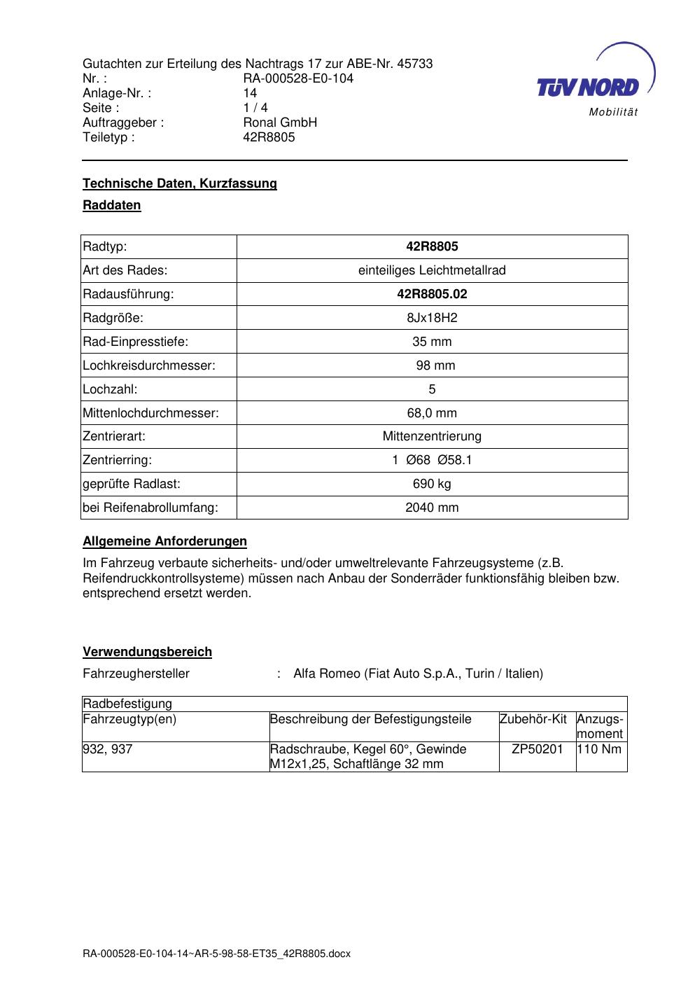 Dieses Gutachten (abe) bezieht sich auf die Alufelge brand-ronal 42R8805 in der Ausführung 8Jx18 ET 0, Mittenloch 0 mm (KBA 45733). Im PDF findest du typischerweise zulässige Reifengrößen, Auflagen/Anbauhinweise und – je nach Dokument – Hinweise zur Eintragung.