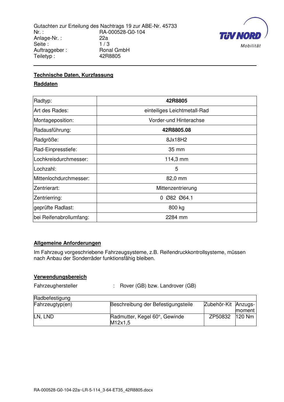 Dieses Gutachten (abe) bezieht sich auf die Alufelge brand-ronal 42R8805 in der Ausführung 8Jx18 ET 0, Mittenloch 0 mm (KBA 45733). Im PDF findest du typischerweise zulässige Reifengrößen, Auflagen/Anbauhinweise und – je nach Dokument – Hinweise zur Eintragung.