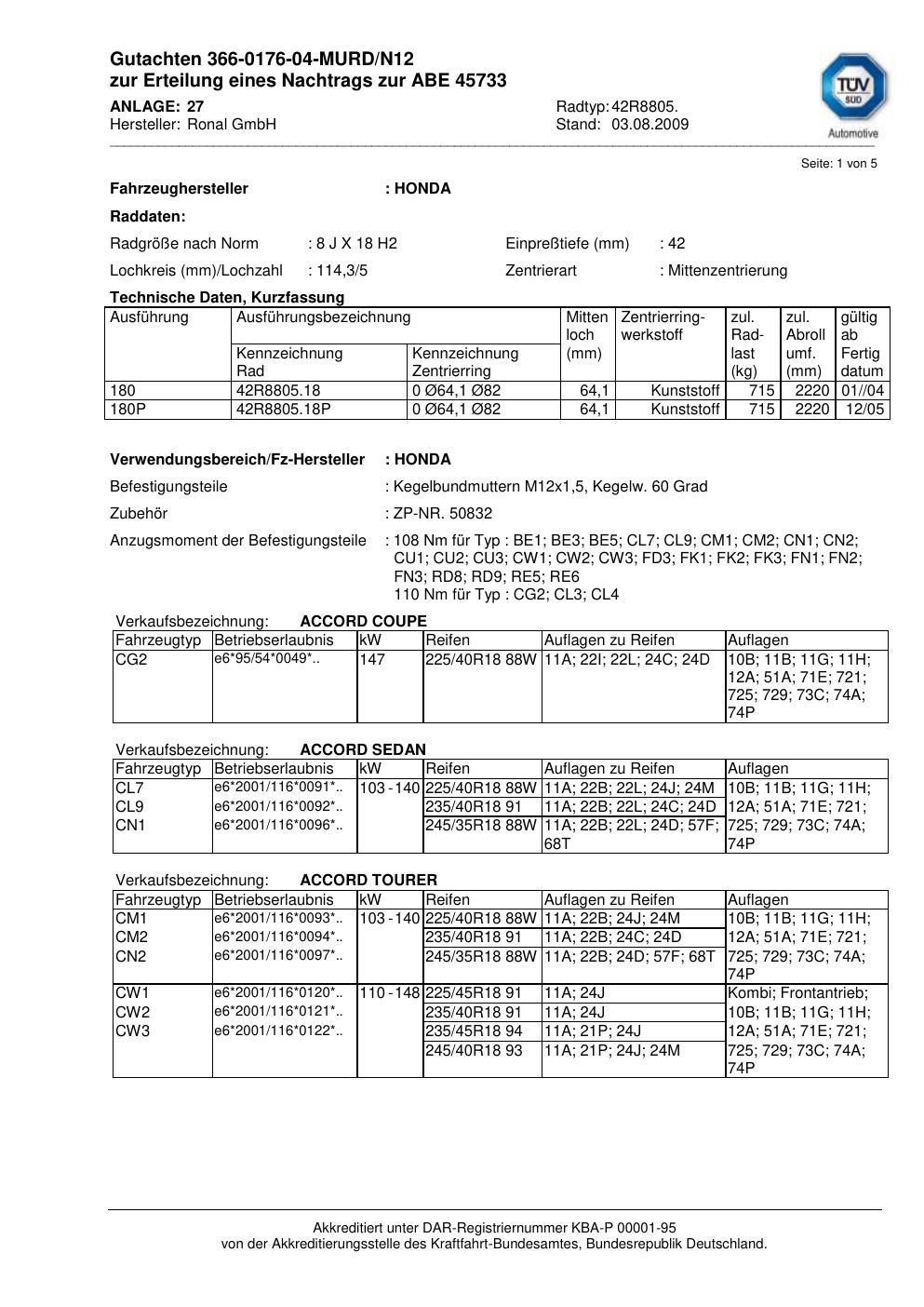 Dieses Gutachten (abe) bezieht sich auf die Alufelge Ronal 42R8805 in der Ausführung 8Jx18 ET 0, Mittenloch 0 mm (KBA 45733). Im PDF findest du typischerweise zulässige Reifengrößen, Auflagen/Anbauhinweise und – je nach Dokument – Hinweise zur Eintragung.