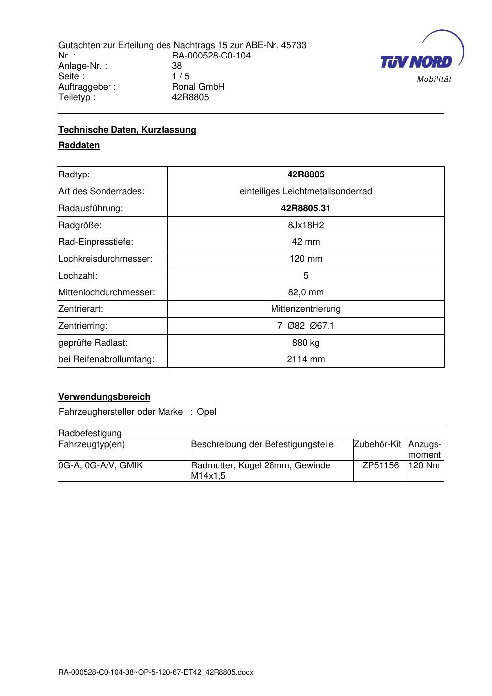 Dieses Gutachten (abe) bezieht sich auf die Alufelge brand-ronal 42R8805 in der Ausführung 8Jx18 ET 0, Mittenloch 0 mm (KBA 45733). Im PDF findest du typischerweise zulässige Reifengrößen, Auflagen/Anbauhinweise und – je nach Dokument – Hinweise zur Eintragung.