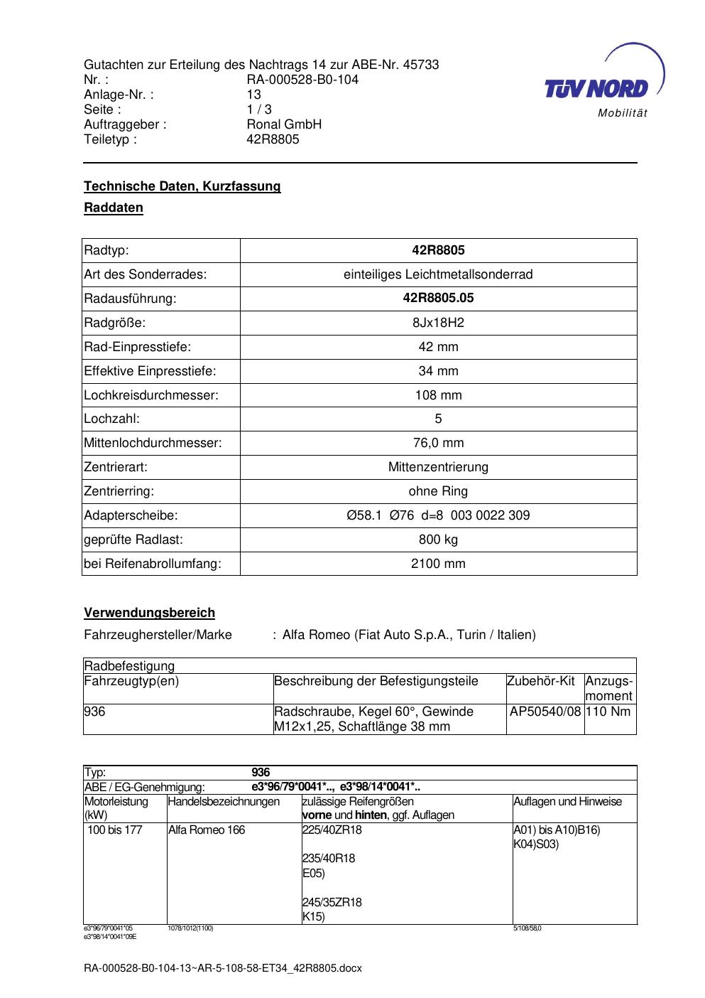 Dieses Gutachten (abe) bezieht sich auf die Alufelge brand-ronal 42R8805 in der Ausführung 8Jx18 ET 0, Mittenloch 0 mm (KBA 45733). Im PDF findest du typischerweise zulässige Reifengrößen, Auflagen/Anbauhinweise und – je nach Dokument – Hinweise zur Eintragung.