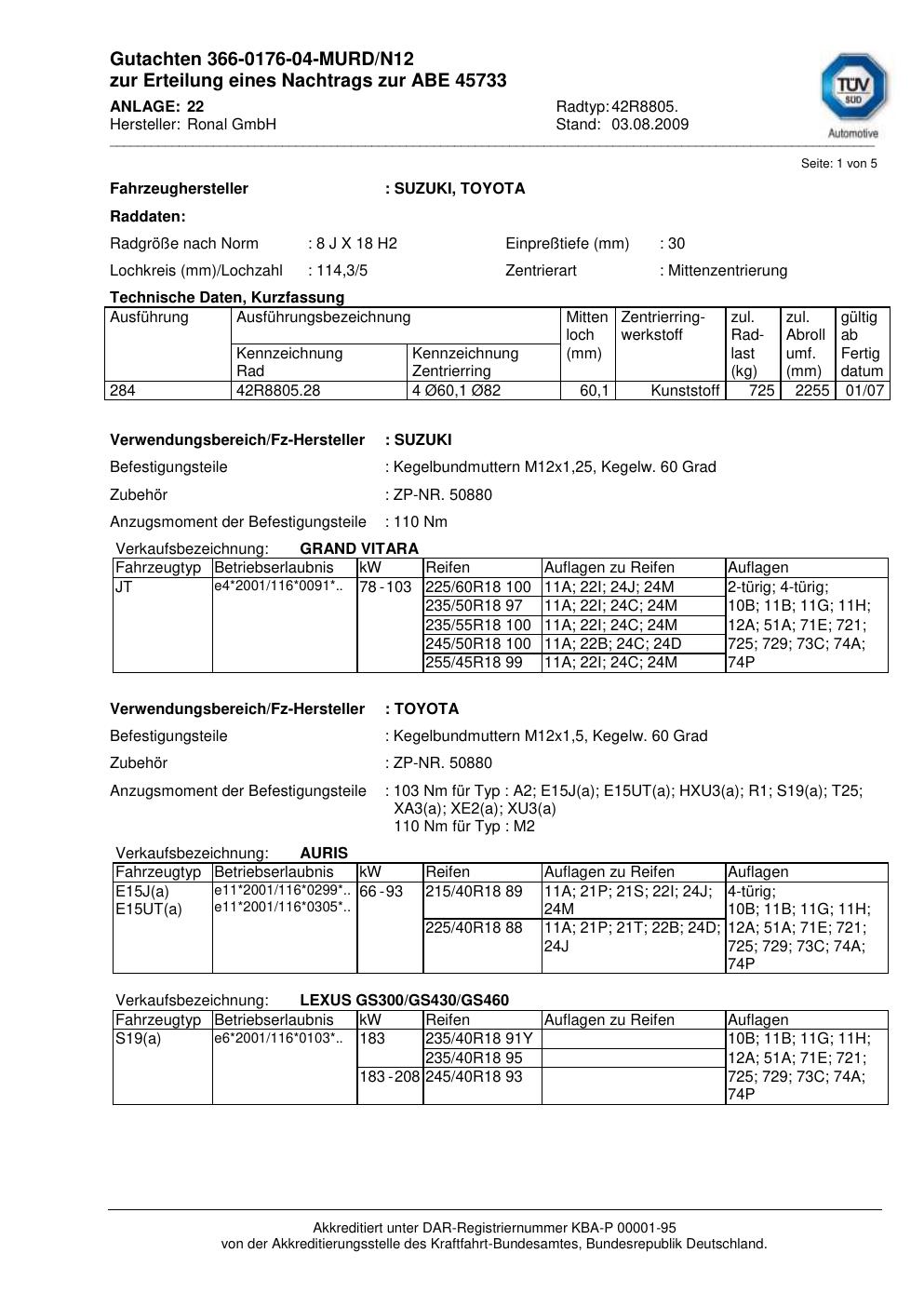 Dieses Gutachten (abe) bezieht sich auf die Alufelge Ronal 42R8805 in der Ausführung 8Jx18 ET 0, Mittenloch 0 mm (KBA 45733). Im PDF findest du typischerweise zulässige Reifengrößen, Auflagen/Anbauhinweise und – je nach Dokument – Hinweise zur Eintragung.