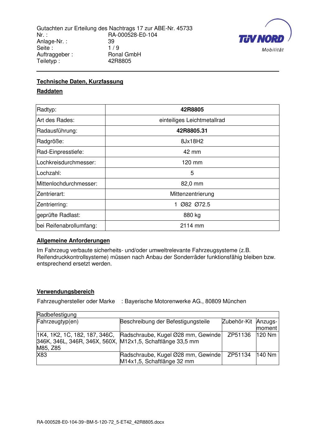 Dieses Gutachten (abe) bezieht sich auf die Alufelge brand-ronal 42R8805 in der Ausführung 8Jx18 ET 0, Mittenloch 0 mm (KBA 45733). Im PDF findest du typischerweise zulässige Reifengrößen, Auflagen/Anbauhinweise und – je nach Dokument – Hinweise zur Eintragung.