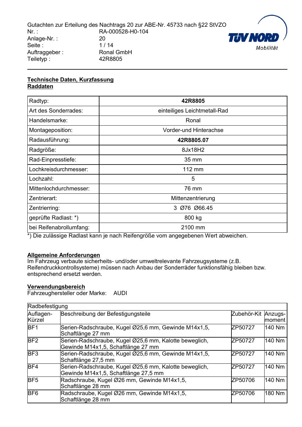Dieses Gutachten (abe) bezieht sich auf die Alufelge brand-ronal 42R8805 in der Ausführung 8Jx18 ET 0, Mittenloch 0 mm (KBA 45733). Im PDF findest du typischerweise zulässige Reifengrößen, Auflagen/Anbauhinweise und – je nach Dokument – Hinweise zur Eintragung.