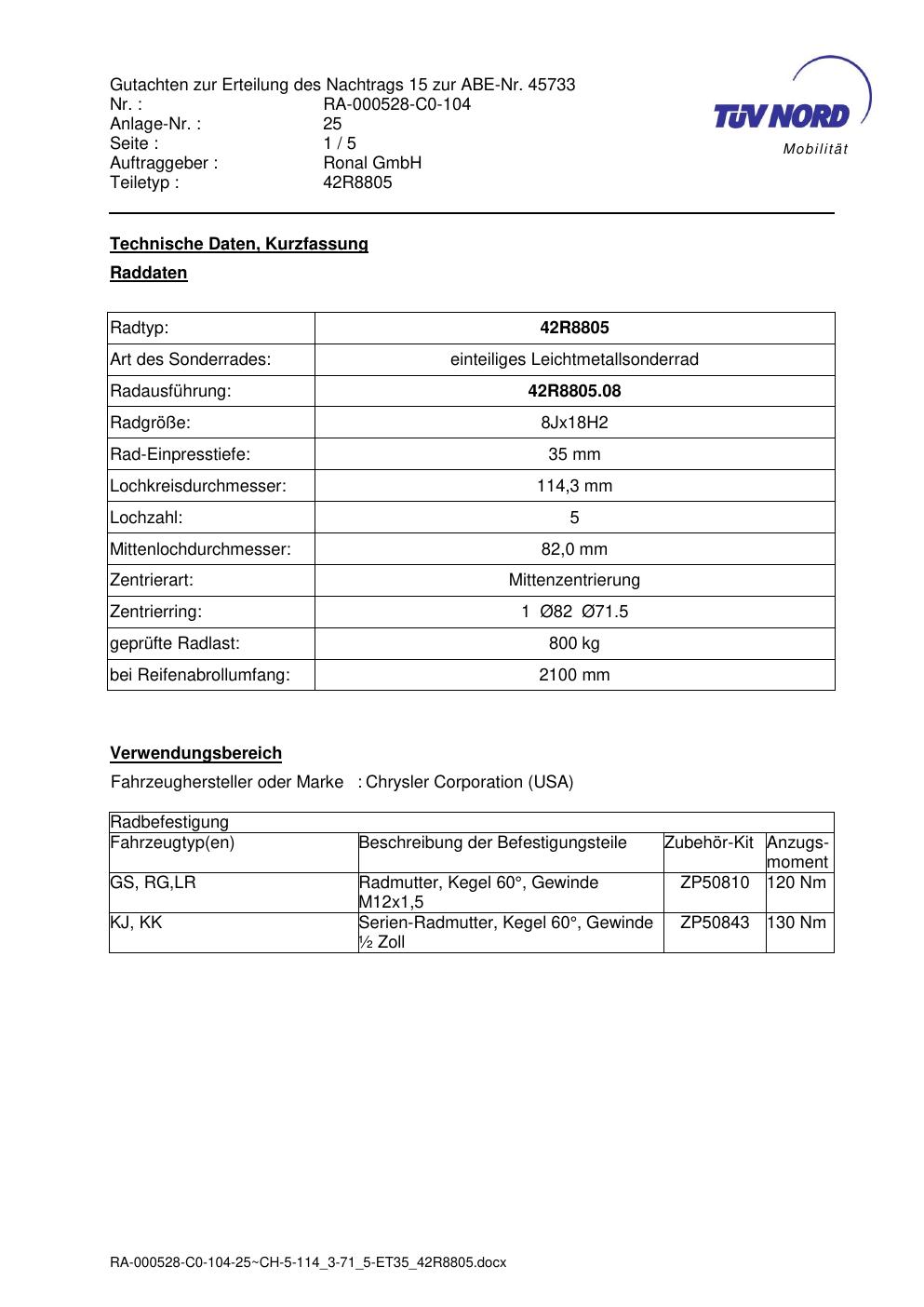 Dieses Gutachten (abe) bezieht sich auf die Alufelge brand-ronal 42R8805 in der Ausführung 8Jx18 ET 0, Mittenloch 0 mm (KBA 45733). Im PDF findest du typischerweise zulässige Reifengrößen, Auflagen/Anbauhinweise und – je nach Dokument – Hinweise zur Eintragung.