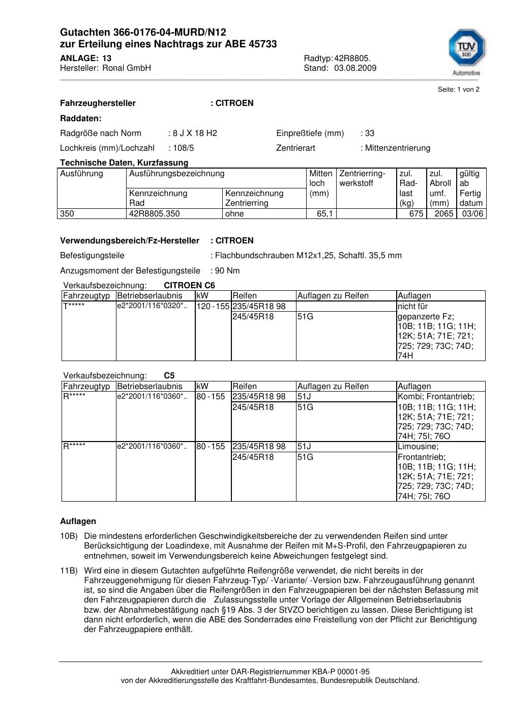 Dieses Gutachten (abe) bezieht sich auf die Alufelge Ronal 42R8805 in der Ausführung 8Jx18 ET 0, Mittenloch 0 mm (KBA 45733). Im PDF findest du typischerweise zulässige Reifengrößen, Auflagen/Anbauhinweise und – je nach Dokument – Hinweise zur Eintragung.
