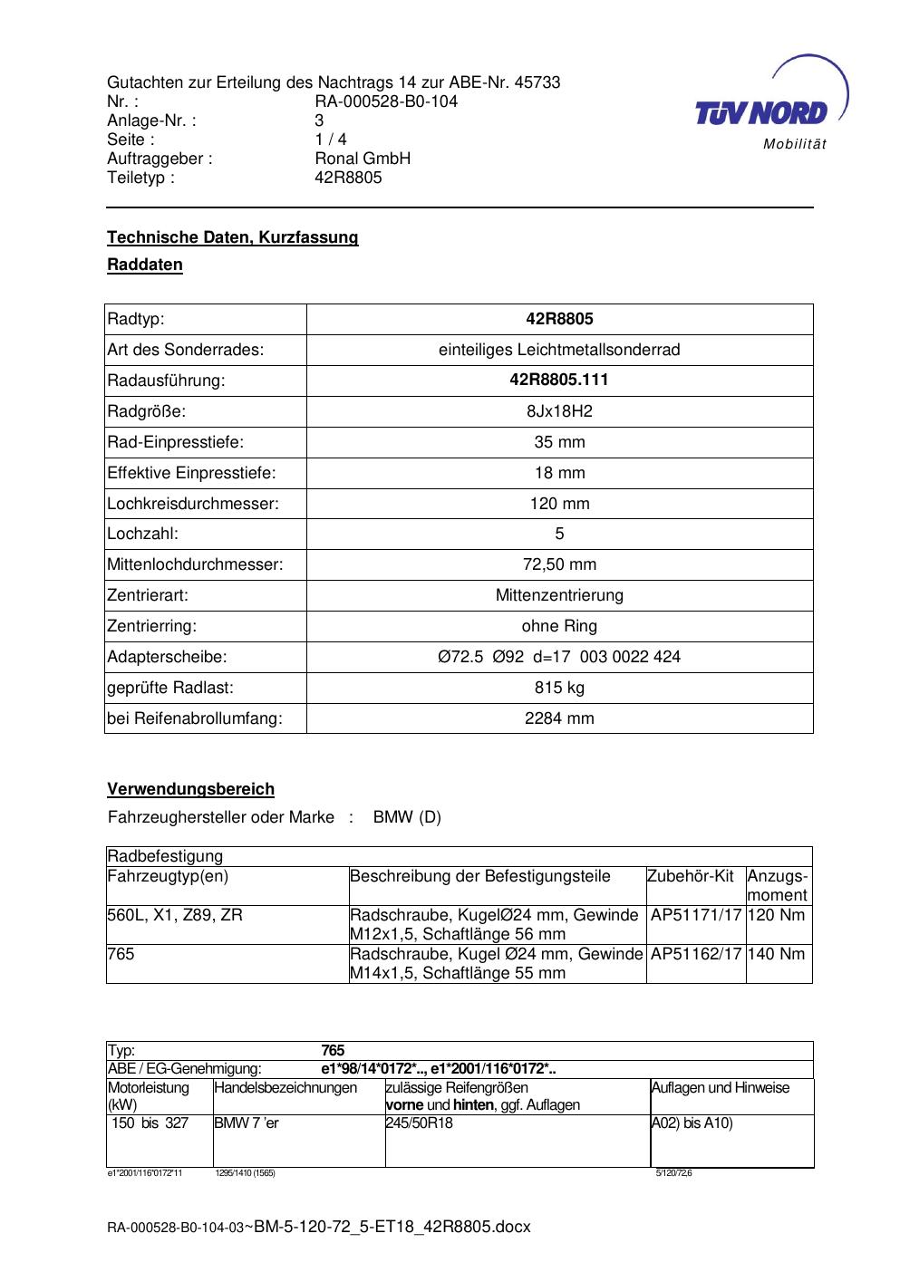 Dieses Gutachten (abe) bezieht sich auf die Alufelge brand-ronal 42R8805 in der Ausführung 8Jx18 ET 0, Mittenloch 0 mm (KBA 45733). Im PDF findest du typischerweise zulässige Reifengrößen, Auflagen/Anbauhinweise und – je nach Dokument – Hinweise zur Eintragung.