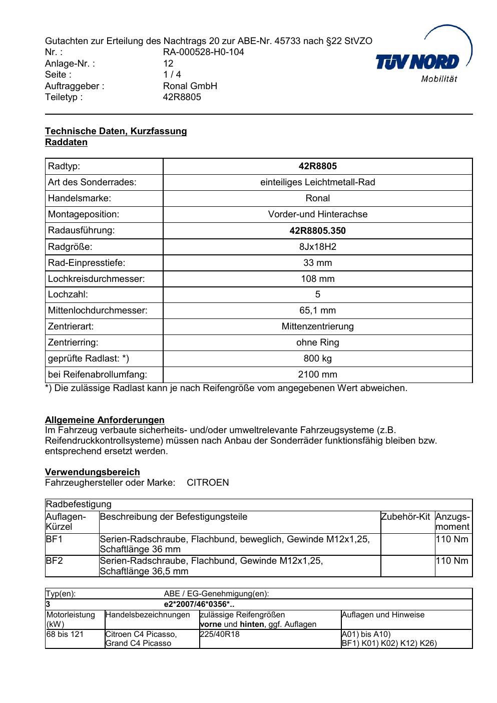Dieses Gutachten (abe) bezieht sich auf die Alufelge brand-ronal 42R8805 in der Ausführung 8Jx18 ET 0, Mittenloch 0 mm (KBA 45733). Im PDF findest du typischerweise zulässige Reifengrößen, Auflagen/Anbauhinweise und – je nach Dokument – Hinweise zur Eintragung.