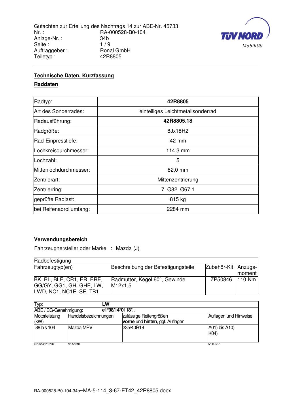 Dieses Gutachten (abe) bezieht sich auf die Alufelge brand-ronal 42R8805 in der Ausführung 8Jx18 ET 0, Mittenloch 0 mm (KBA 45733). Im PDF findest du typischerweise zulässige Reifengrößen, Auflagen/Anbauhinweise und – je nach Dokument – Hinweise zur Eintragung.