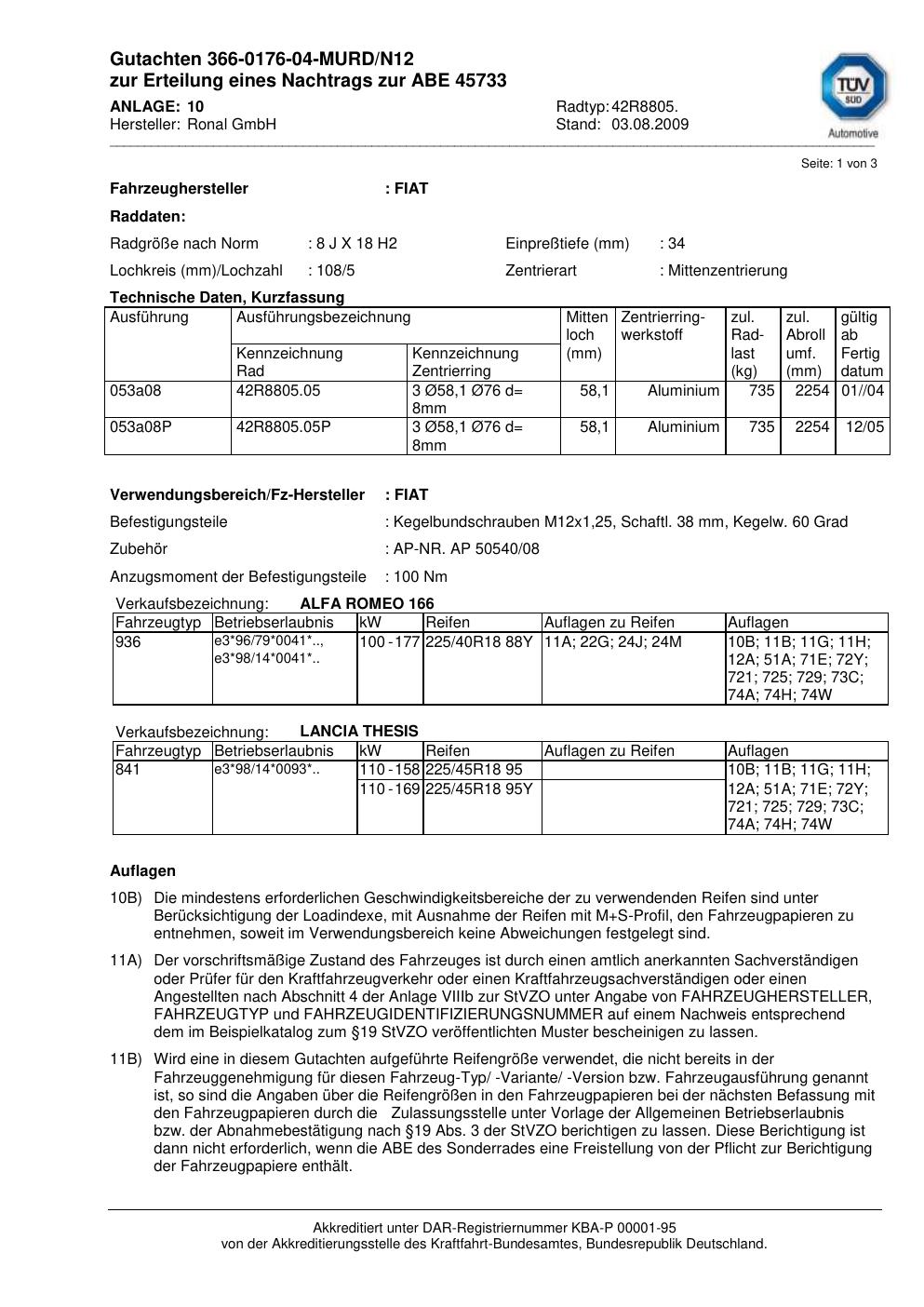 Dieses Gutachten (abe) bezieht sich auf die Alufelge brand-ronal 42R8805 in der Ausführung 8Jx18 ET 0, Mittenloch 0 mm (KBA 45733). Im PDF findest du typischerweise zulässige Reifengrößen, Auflagen/Anbauhinweise und – je nach Dokument – Hinweise zur Eintragung.