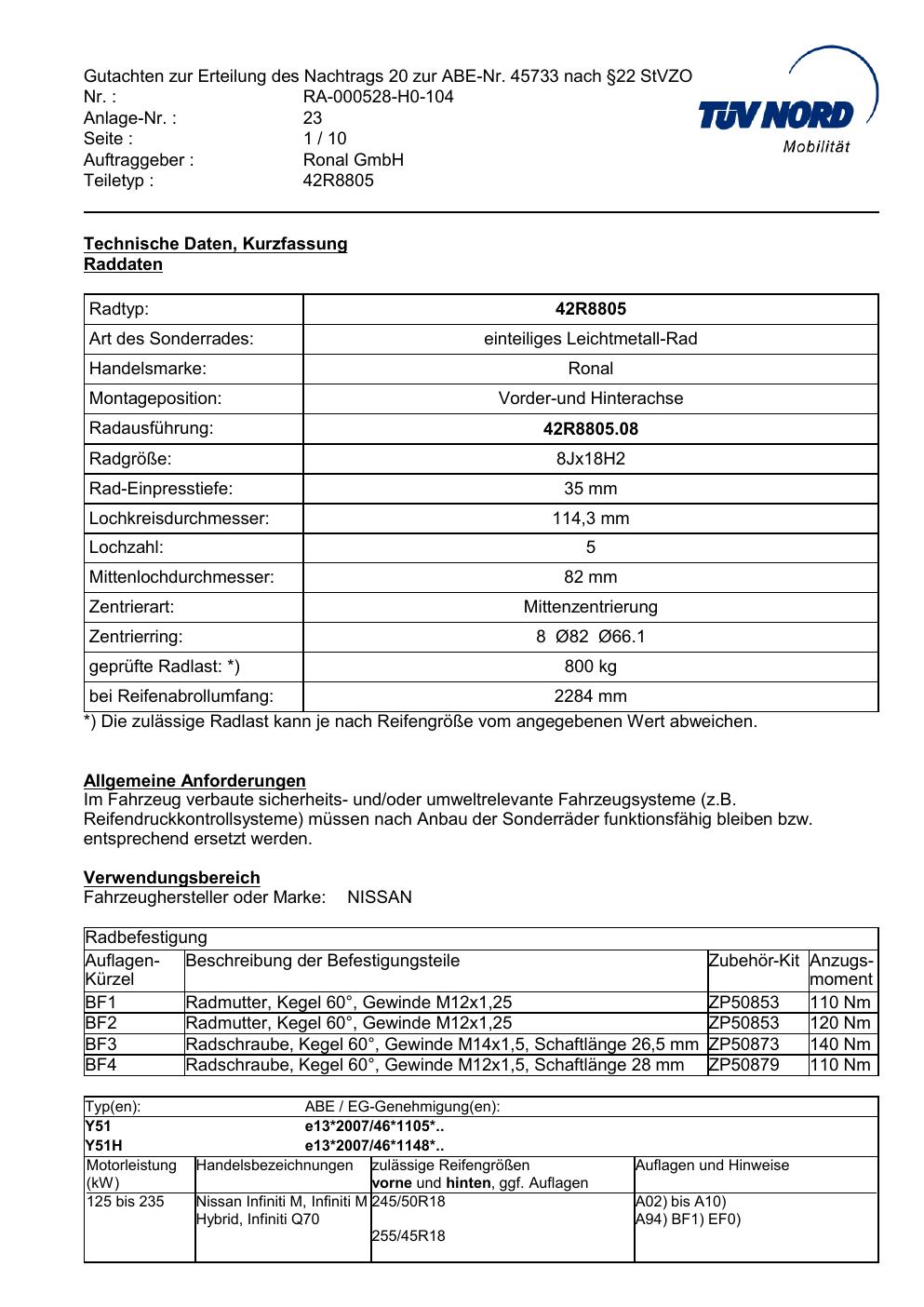 Dieses Gutachten (abe) bezieht sich auf die Alufelge brand-ronal 42R8805 in der Ausführung 8Jx18 ET 0, Mittenloch 0 mm (KBA 45733). Im PDF findest du typischerweise zulässige Reifengrößen, Auflagen/Anbauhinweise und – je nach Dokument – Hinweise zur Eintragung.