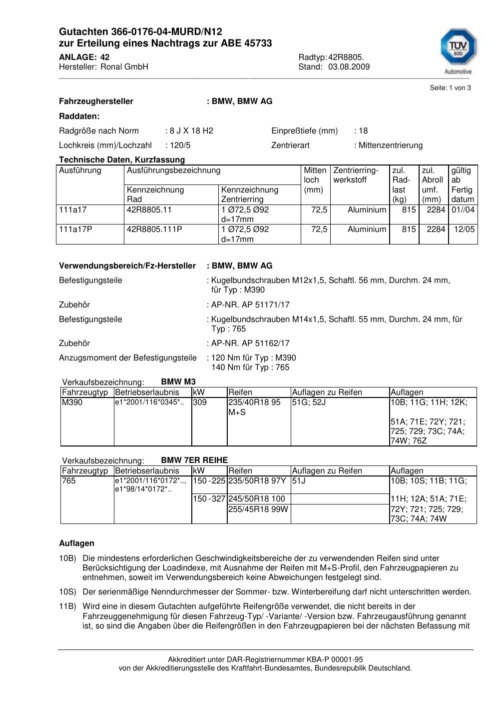 Dieses Gutachten (abe) bezieht sich auf die Alufelge brand-ronal 42R8805 in der Ausführung 8Jx18 ET 0, Mittenloch 0 mm (KBA 45733). Im PDF findest du typischerweise zulässige Reifengrößen, Auflagen/Anbauhinweise und – je nach Dokument – Hinweise zur Eintragung.