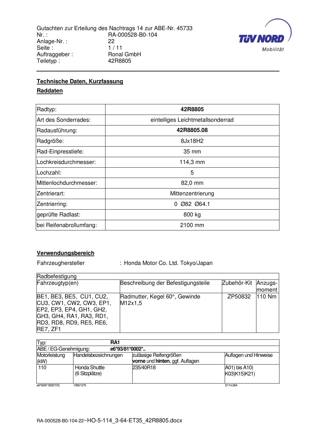 Dieses Gutachten (abe) bezieht sich auf die Alufelge brand-ronal 42R8805 in der Ausführung 8Jx18 ET 0, Mittenloch 0 mm (KBA 45733). Im PDF findest du typischerweise zulässige Reifengrößen, Auflagen/Anbauhinweise und – je nach Dokument – Hinweise zur Eintragung.
