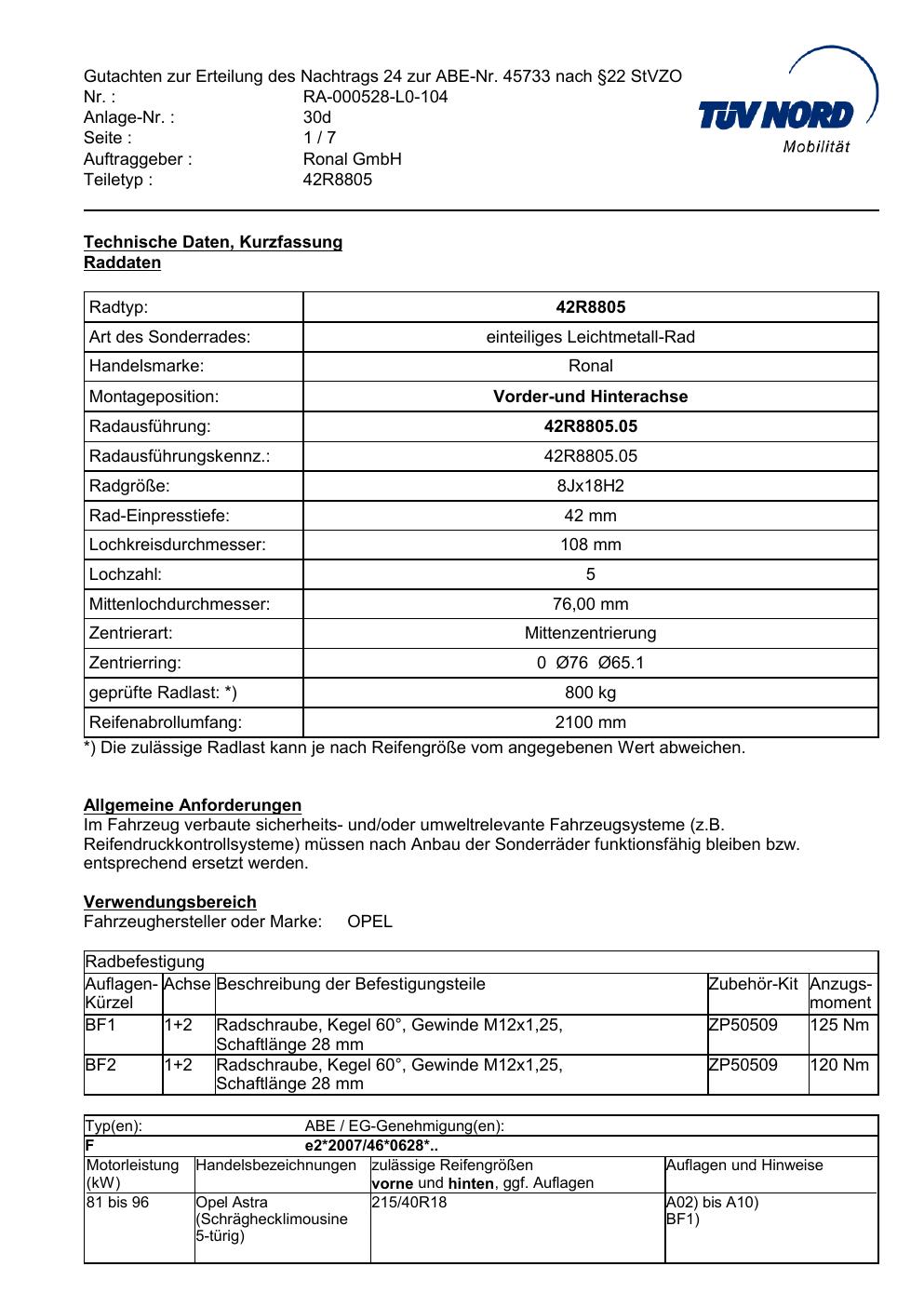 Dieses Gutachten (abe) bezieht sich auf die Alufelge brand-ronal 42R8805 in der Ausführung 8Jx18 ET 0, Mittenloch 0 mm (KBA 45733). Im PDF findest du typischerweise zulässige Reifengrößen, Auflagen/Anbauhinweise und – je nach Dokument – Hinweise zur Eintragung.