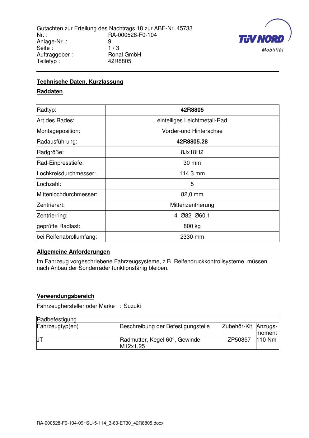 Dieses Gutachten (abe) bezieht sich auf die Alufelge brand-ronal 42R8805 in der Ausführung 8Jx18 ET 0, Mittenloch 0 mm (KBA 45733). Im PDF findest du typischerweise zulässige Reifengrößen, Auflagen/Anbauhinweise und – je nach Dokument – Hinweise zur Eintragung.