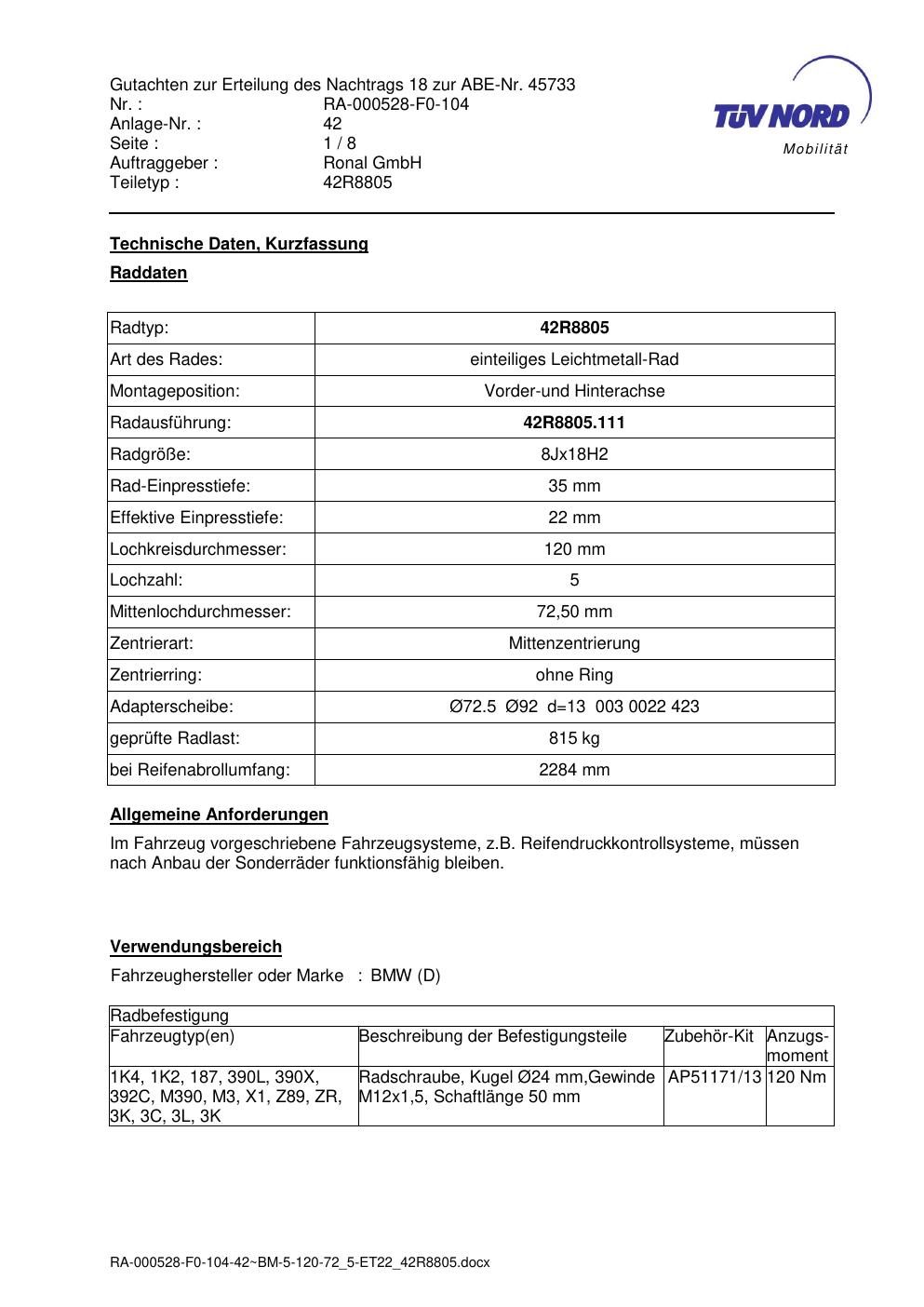Dieses Gutachten (abe) bezieht sich auf die Alufelge brand-ronal 42R8805 in der Ausführung 8Jx18 ET 0, Mittenloch 0 mm (KBA 45733). Im PDF findest du typischerweise zulässige Reifengrößen, Auflagen/Anbauhinweise und – je nach Dokument – Hinweise zur Eintragung.
