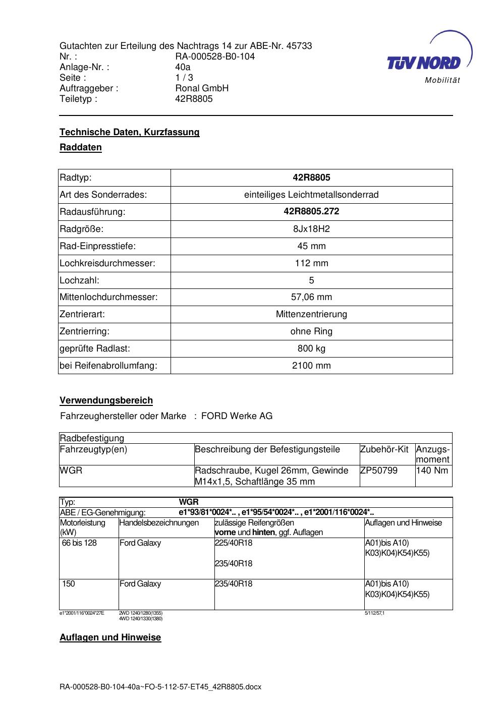 Dieses Gutachten (abe) bezieht sich auf die Alufelge brand-ronal 42R8805 in der Ausführung 8Jx18 ET 0, Mittenloch 0 mm (KBA 45733). Im PDF findest du typischerweise zulässige Reifengrößen, Auflagen/Anbauhinweise und – je nach Dokument – Hinweise zur Eintragung.