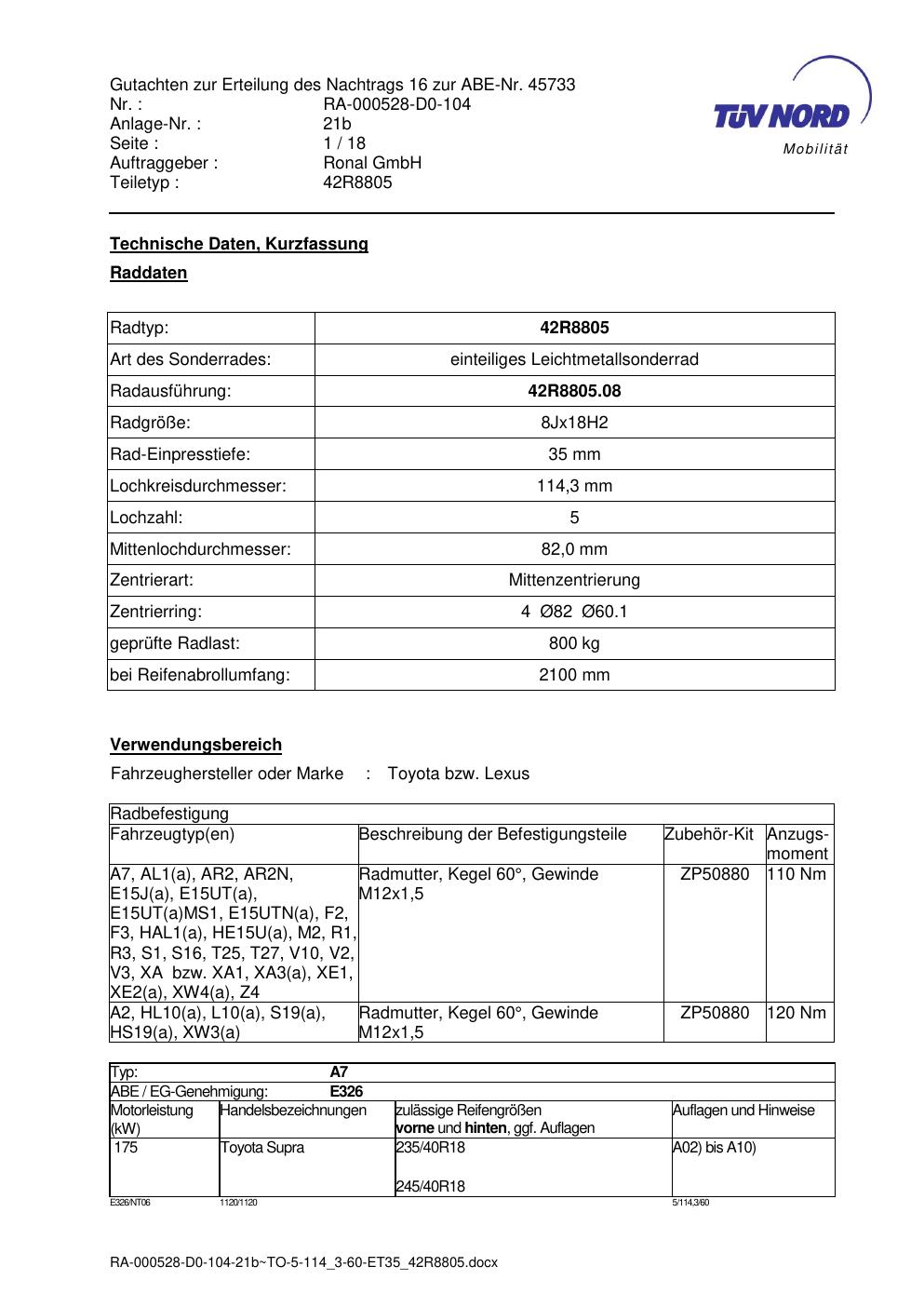 Dieses Gutachten (abe) bezieht sich auf die Alufelge brand-ronal 42R8805 in der Ausführung 8Jx18 ET 0, Mittenloch 0 mm (KBA 45733). Im PDF findest du typischerweise zulässige Reifengrößen, Auflagen/Anbauhinweise und – je nach Dokument – Hinweise zur Eintragung.