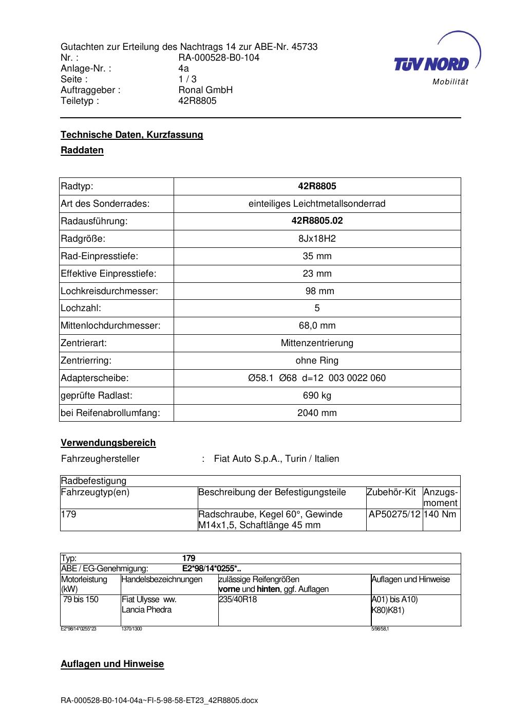 Dieses Gutachten (abe) bezieht sich auf die Alufelge brand-ronal 42R8805 in der Ausführung 8Jx18 ET 0, Mittenloch 0 mm (KBA 45733). Im PDF findest du typischerweise zulässige Reifengrößen, Auflagen/Anbauhinweise und – je nach Dokument – Hinweise zur Eintragung.