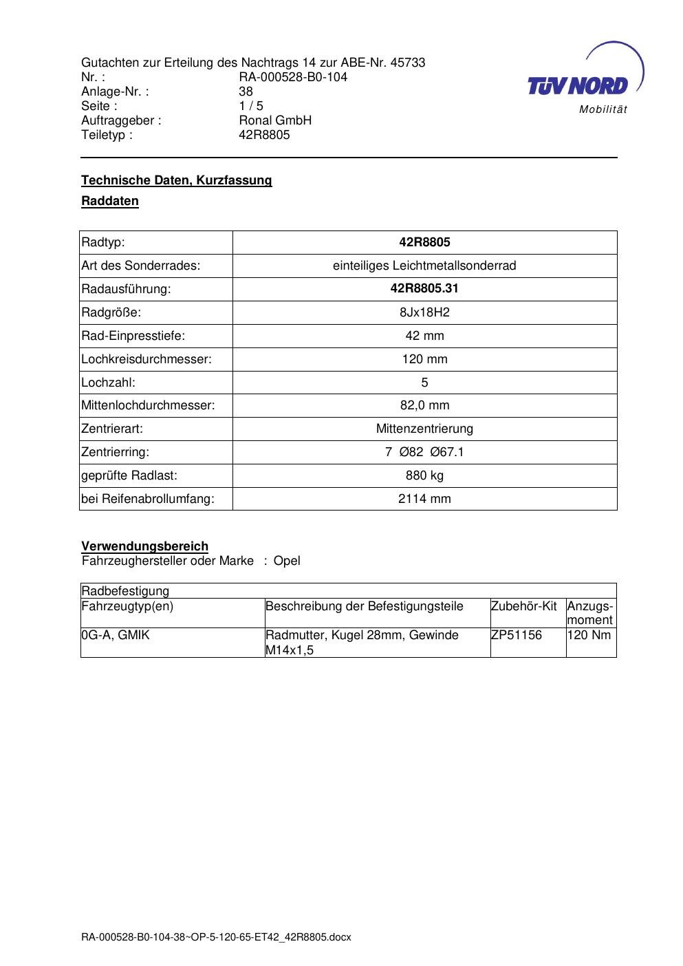 Dieses Gutachten (abe) bezieht sich auf die Alufelge brand-ronal 42R8805 in der Ausführung 8Jx18 ET 0, Mittenloch 0 mm (KBA 45733). Im PDF findest du typischerweise zulässige Reifengrößen, Auflagen/Anbauhinweise und – je nach Dokument – Hinweise zur Eintragung.
