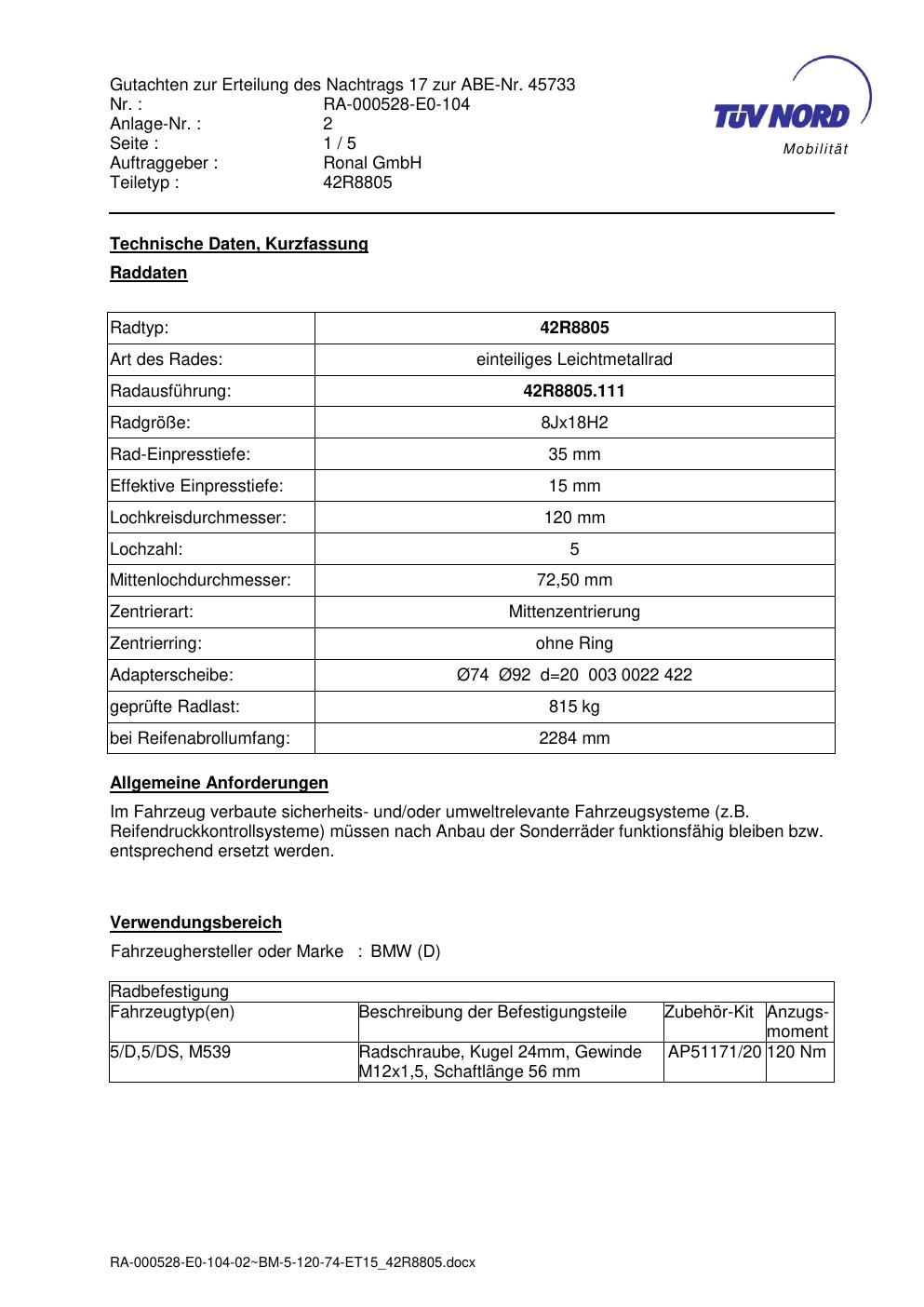 Dieses Gutachten (abe) bezieht sich auf die Alufelge brand-ronal 42R8805 in der Ausführung 8Jx18 ET 0, Mittenloch 0 mm (KBA 45733). Im PDF findest du typischerweise zulässige Reifengrößen, Auflagen/Anbauhinweise und – je nach Dokument – Hinweise zur Eintragung.