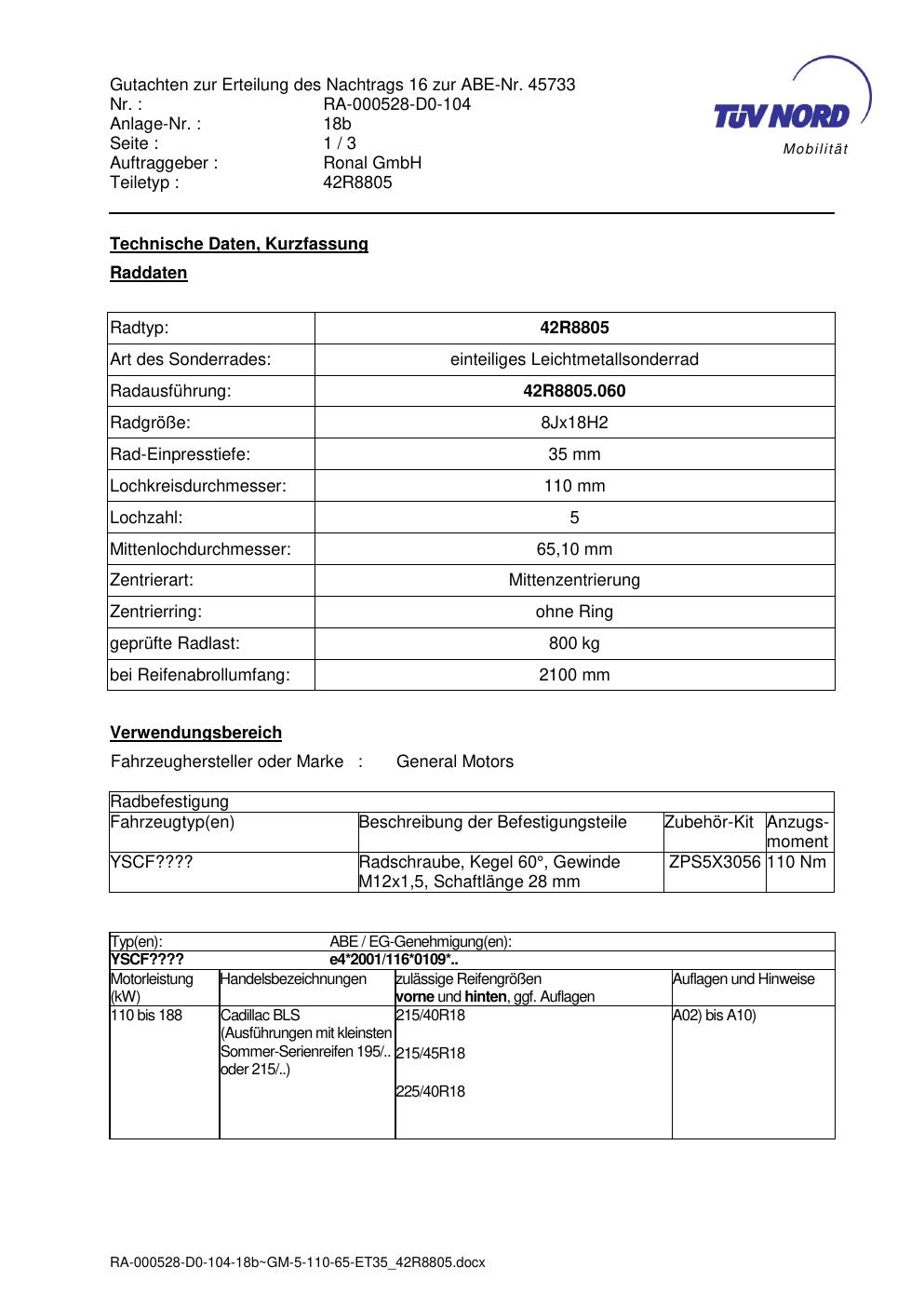 Dieses Gutachten (abe) bezieht sich auf die Alufelge brand-ronal 42R8805 in der Ausführung 8Jx18 ET 0, Mittenloch 0 mm (KBA 45733). Im PDF findest du typischerweise zulässige Reifengrößen, Auflagen/Anbauhinweise und – je nach Dokument – Hinweise zur Eintragung.