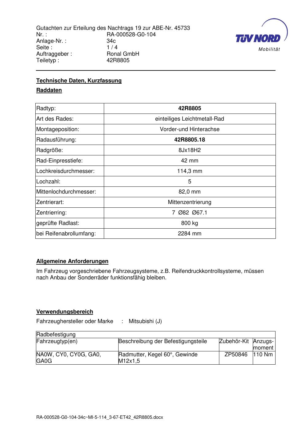 Dieses Gutachten (abe) bezieht sich auf die Alufelge brand-ronal 42R8805 in der Ausführung 8Jx18 ET 0, Mittenloch 0 mm (KBA 45733). Im PDF findest du typischerweise zulässige Reifengrößen, Auflagen/Anbauhinweise und – je nach Dokument – Hinweise zur Eintragung.