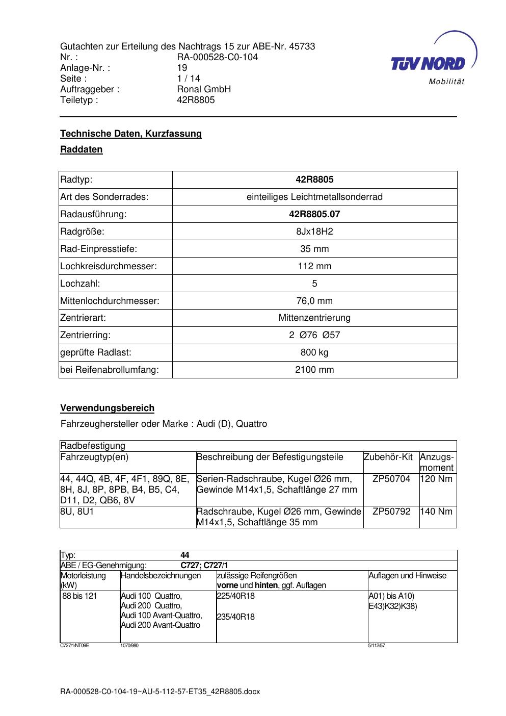 Dieses Gutachten (abe) bezieht sich auf die Alufelge brand-ronal 42R8805 in der Ausführung 8Jx18 ET 0, Mittenloch 0 mm (KBA 45733). Im PDF findest du typischerweise zulässige Reifengrößen, Auflagen/Anbauhinweise und – je nach Dokument – Hinweise zur Eintragung.