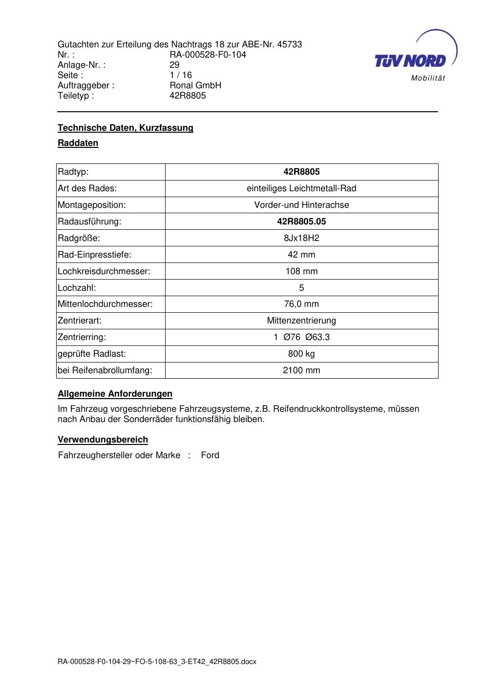 Dieses Gutachten (abe) bezieht sich auf die Alufelge brand-ronal 42R8805 in der Ausführung 8Jx18 ET 0, Mittenloch 0 mm (KBA 45733). Im PDF findest du typischerweise zulässige Reifengrößen, Auflagen/Anbauhinweise und – je nach Dokument – Hinweise zur Eintragung.