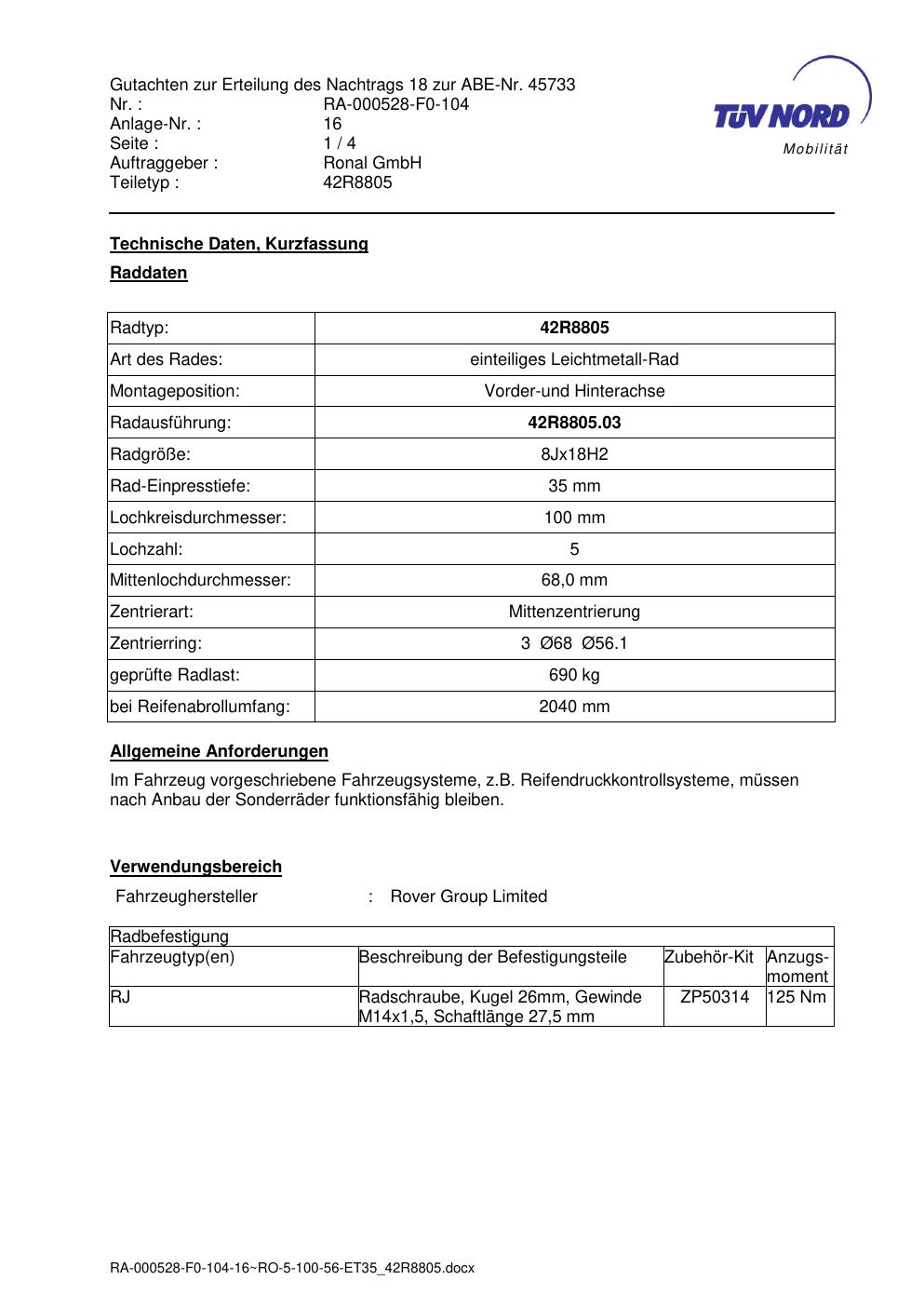 Dieses Gutachten (abe) bezieht sich auf die Alufelge brand-ronal 42R8805 in der Ausführung 8Jx18 ET 0, Mittenloch 0 mm (KBA 45733). Im PDF findest du typischerweise zulässige Reifengrößen, Auflagen/Anbauhinweise und – je nach Dokument – Hinweise zur Eintragung.