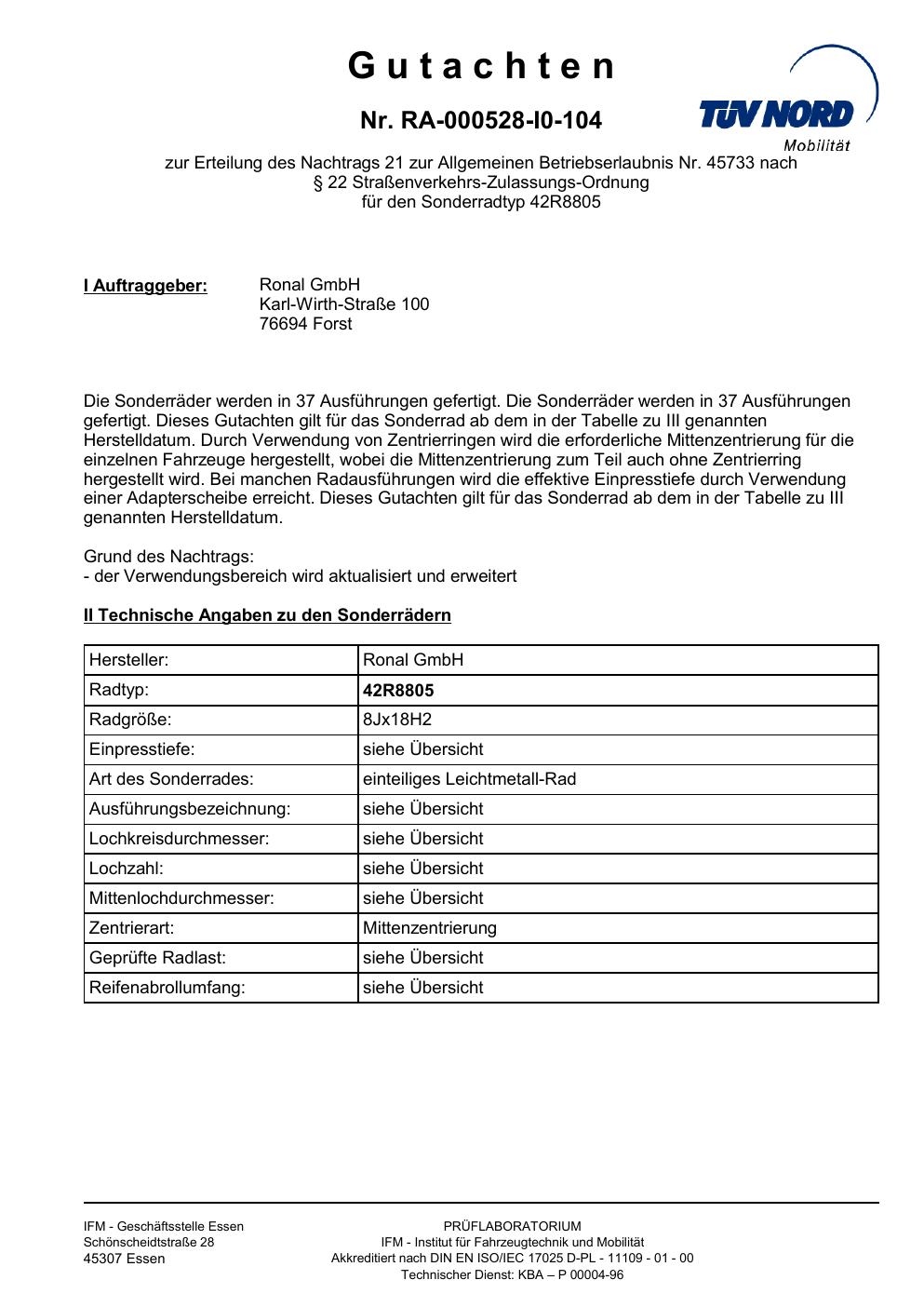 Dieses Gutachten (abe) bezieht sich auf die Alufelge brand-ronal 42R8805 in der Ausführung 8Jx18 ET 0, Mittenloch 0 mm (KBA 45733). Im PDF findest du typischerweise zulässige Reifengrößen, Auflagen/Anbauhinweise und – je nach Dokument – Hinweise zur Eintragung.