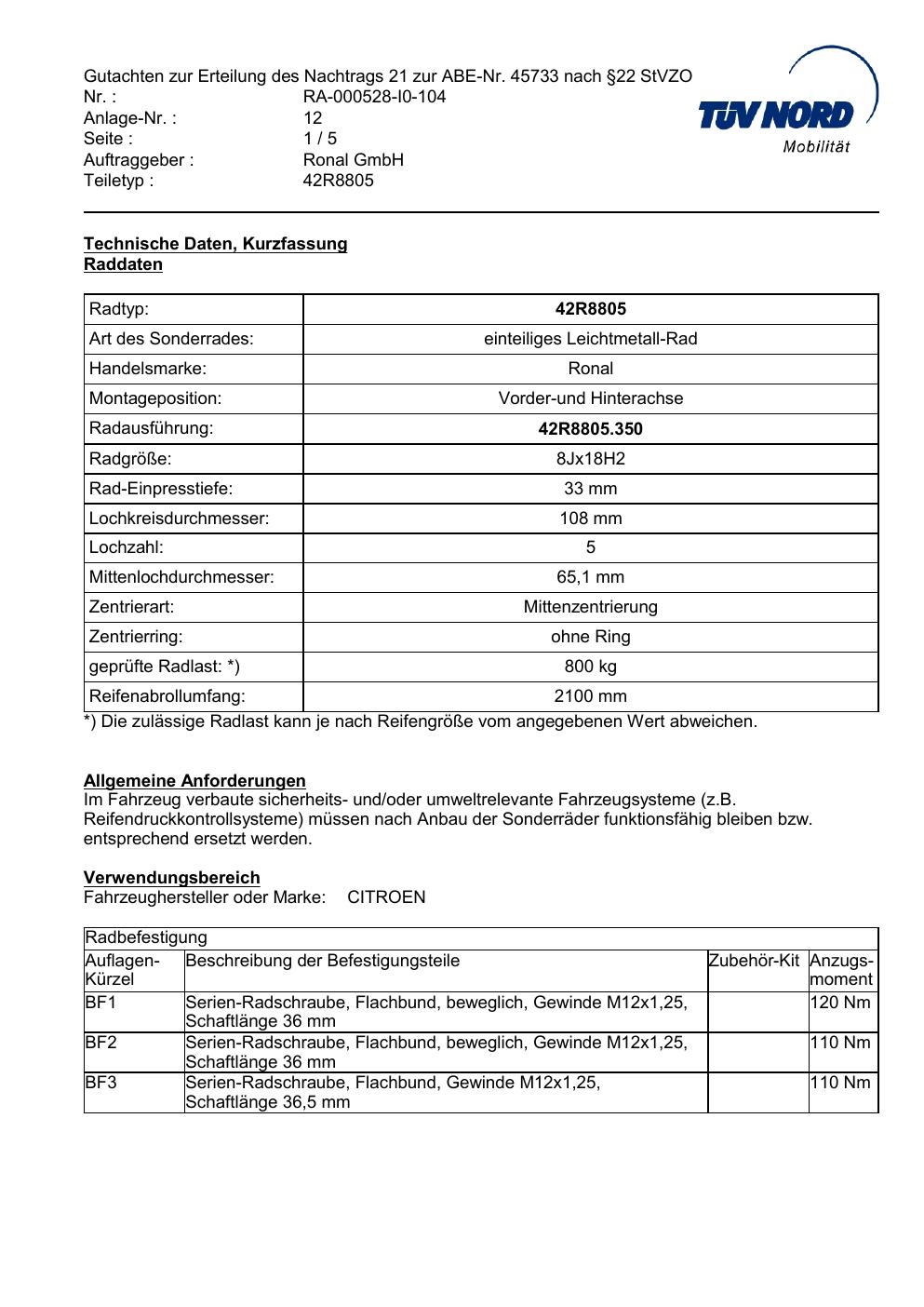Dieses Gutachten (abe) bezieht sich auf die Alufelge brand-ronal 42R8805 in der Ausführung 8Jx18 ET 0, Mittenloch 0 mm (KBA 45733). Im PDF findest du typischerweise zulässige Reifengrößen, Auflagen/Anbauhinweise und – je nach Dokument – Hinweise zur Eintragung.