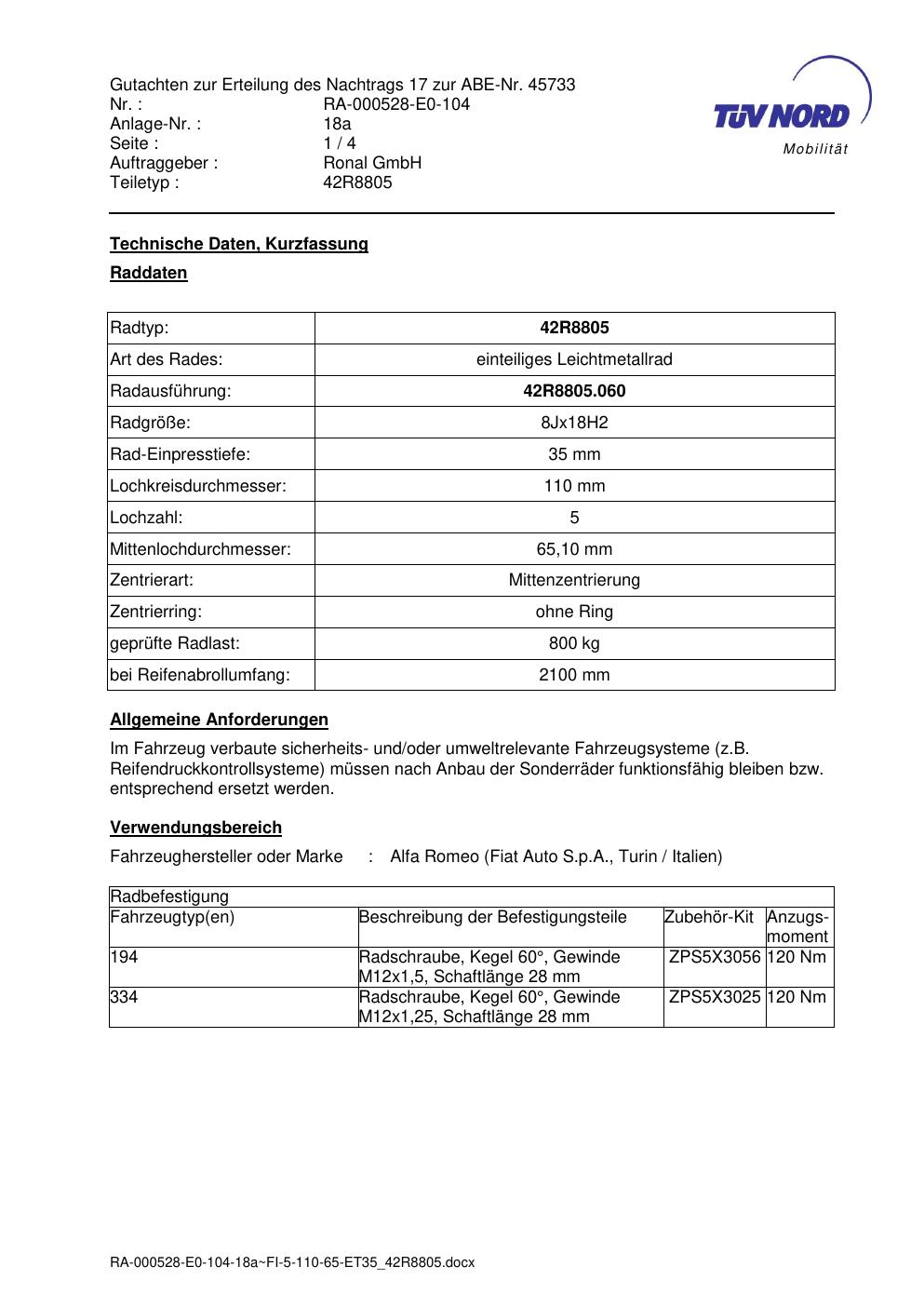 Dieses Gutachten (abe) bezieht sich auf die Alufelge brand-ronal 42R8805 in der Ausführung 8Jx18 ET 0, Mittenloch 0 mm (KBA 45733). Im PDF findest du typischerweise zulässige Reifengrößen, Auflagen/Anbauhinweise und – je nach Dokument – Hinweise zur Eintragung.