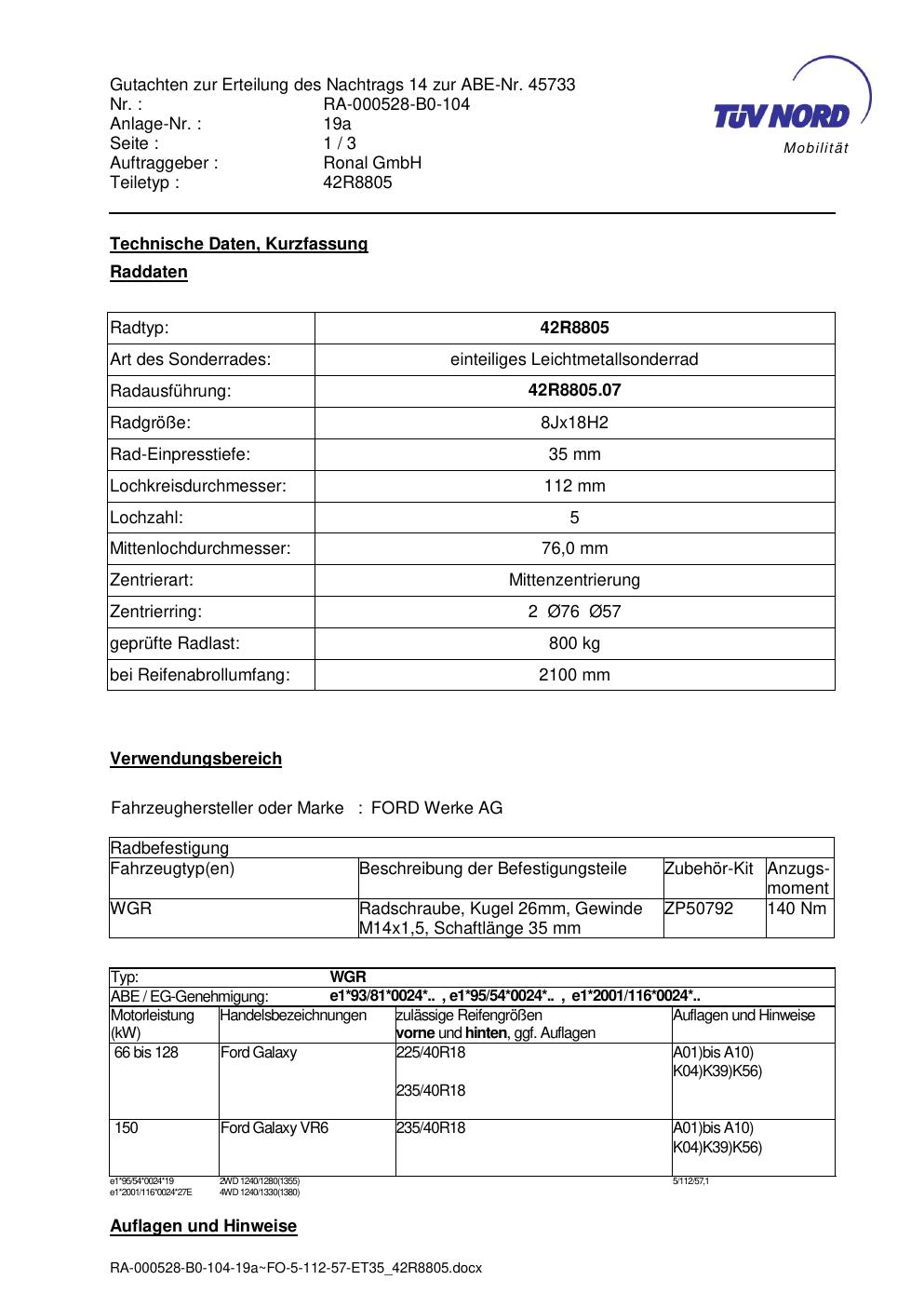 Dieses Gutachten (abe) bezieht sich auf die Alufelge brand-ronal 42R8805 in der Ausführung 8Jx18 ET 0, Mittenloch 0 mm (KBA 45733). Im PDF findest du typischerweise zulässige Reifengrößen, Auflagen/Anbauhinweise und – je nach Dokument – Hinweise zur Eintragung.