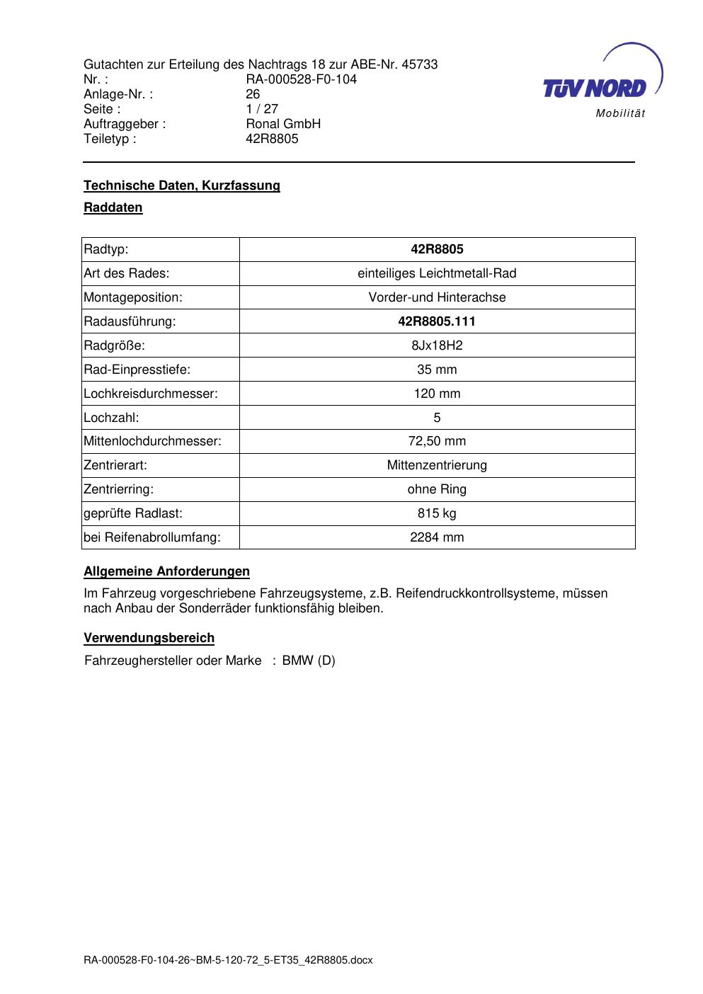 Dieses Gutachten (abe) bezieht sich auf die Alufelge brand-ronal 42R8805 in der Ausführung 8Jx18 ET 0, Mittenloch 0 mm (KBA 45733). Im PDF findest du typischerweise zulässige Reifengrößen, Auflagen/Anbauhinweise und – je nach Dokument – Hinweise zur Eintragung.