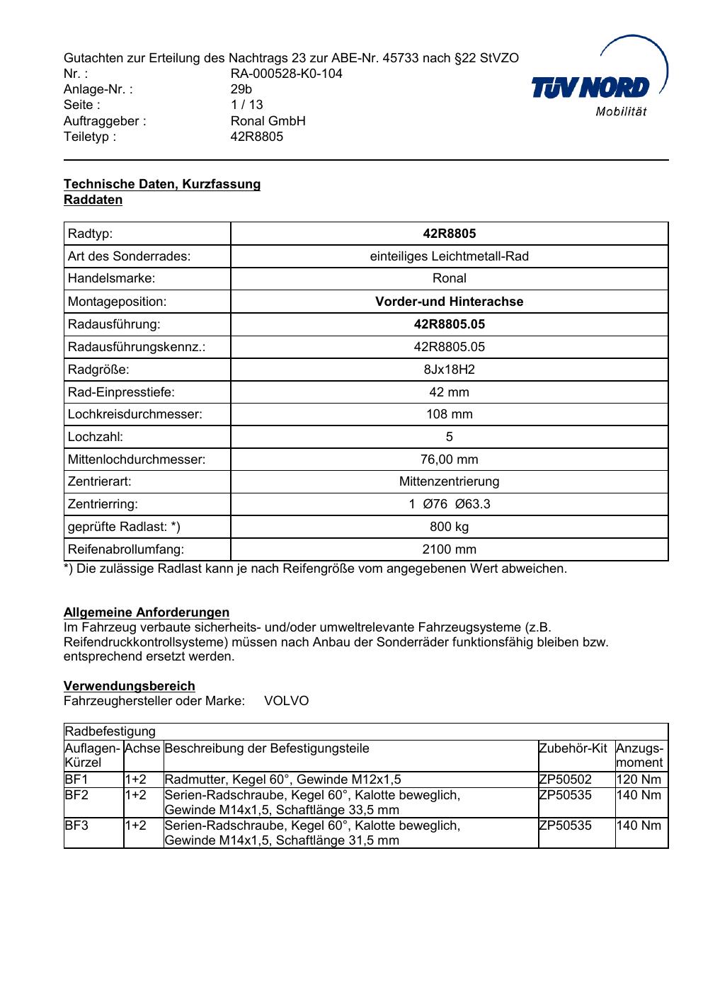 Dieses Gutachten (abe) bezieht sich auf die Alufelge brand-ronal 42R8805 in der Ausführung 8Jx18 ET 0, Mittenloch 0 mm (KBA 45733). Im PDF findest du typischerweise zulässige Reifengrößen, Auflagen/Anbauhinweise und – je nach Dokument – Hinweise zur Eintragung.