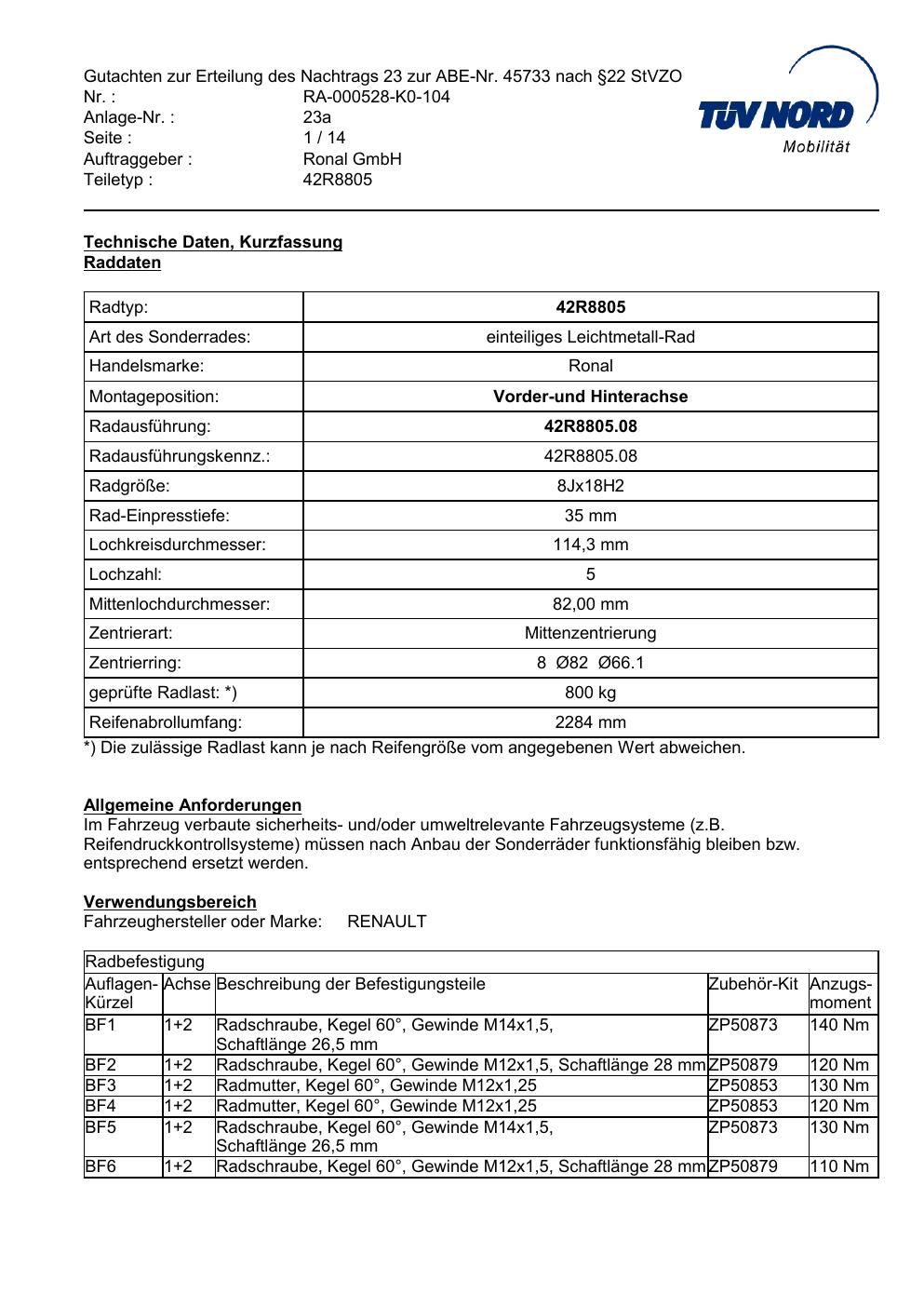 Dieses Gutachten (abe) bezieht sich auf die Alufelge brand-ronal 42R8805 in der Ausführung 8Jx18 ET 0, Mittenloch 0 mm (KBA 45733). Im PDF findest du typischerweise zulässige Reifengrößen, Auflagen/Anbauhinweise und – je nach Dokument – Hinweise zur Eintragung.