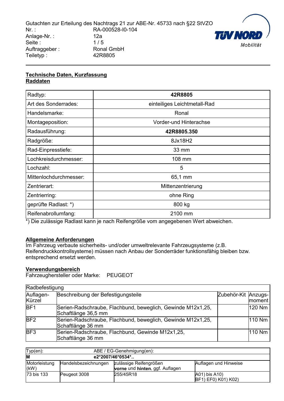 Dieses Gutachten (abe) bezieht sich auf die Alufelge brand-ronal 42R8805 in der Ausführung 8Jx18 ET 0, Mittenloch 0 mm (KBA 45733). Im PDF findest du typischerweise zulässige Reifengrößen, Auflagen/Anbauhinweise und – je nach Dokument – Hinweise zur Eintragung.