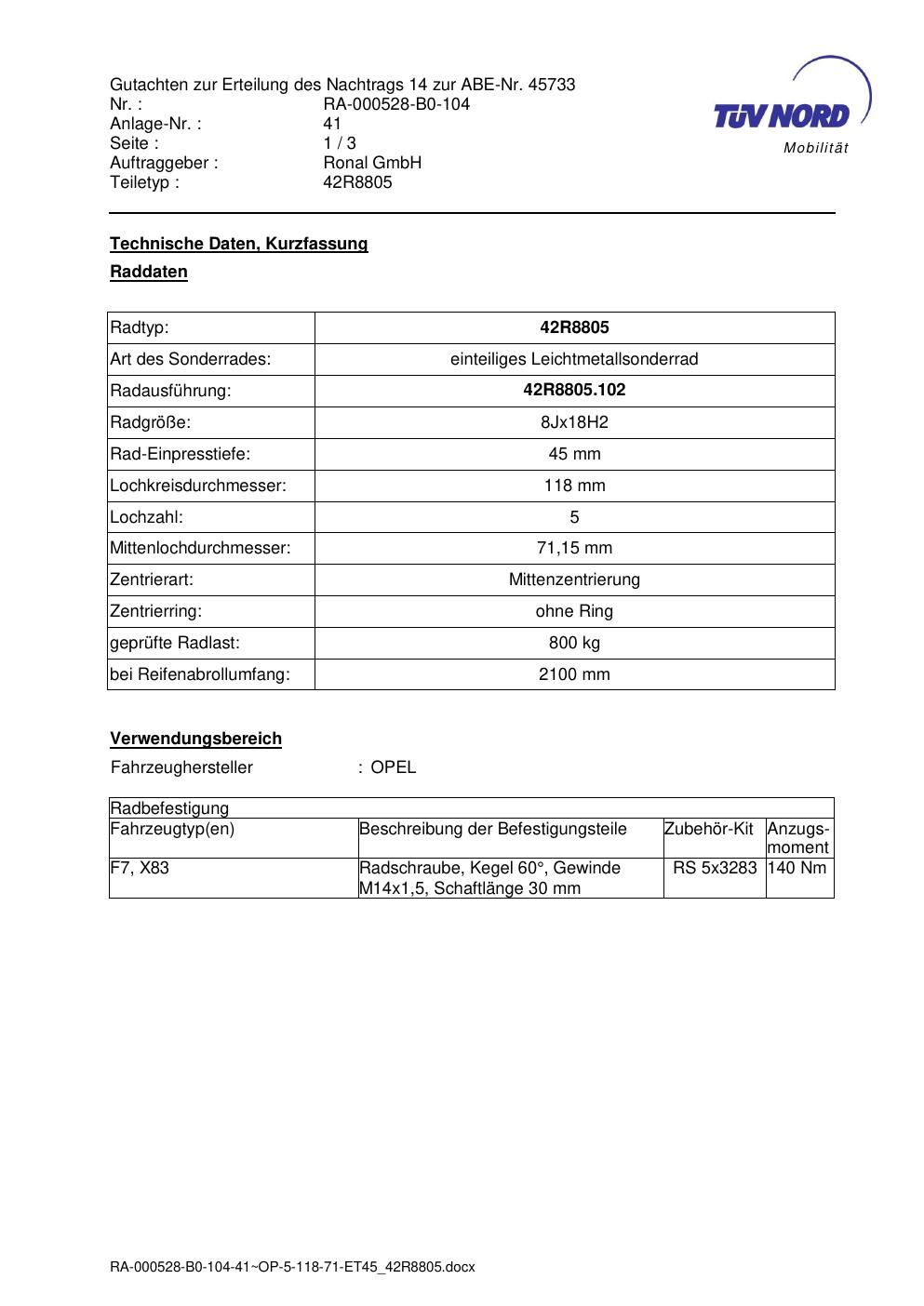 Dieses Gutachten (abe) bezieht sich auf die Alufelge brand-ronal 42R8805 in der Ausführung 8Jx18 ET 0, Mittenloch 0 mm (KBA 45733). Im PDF findest du typischerweise zulässige Reifengrößen, Auflagen/Anbauhinweise und – je nach Dokument – Hinweise zur Eintragung.