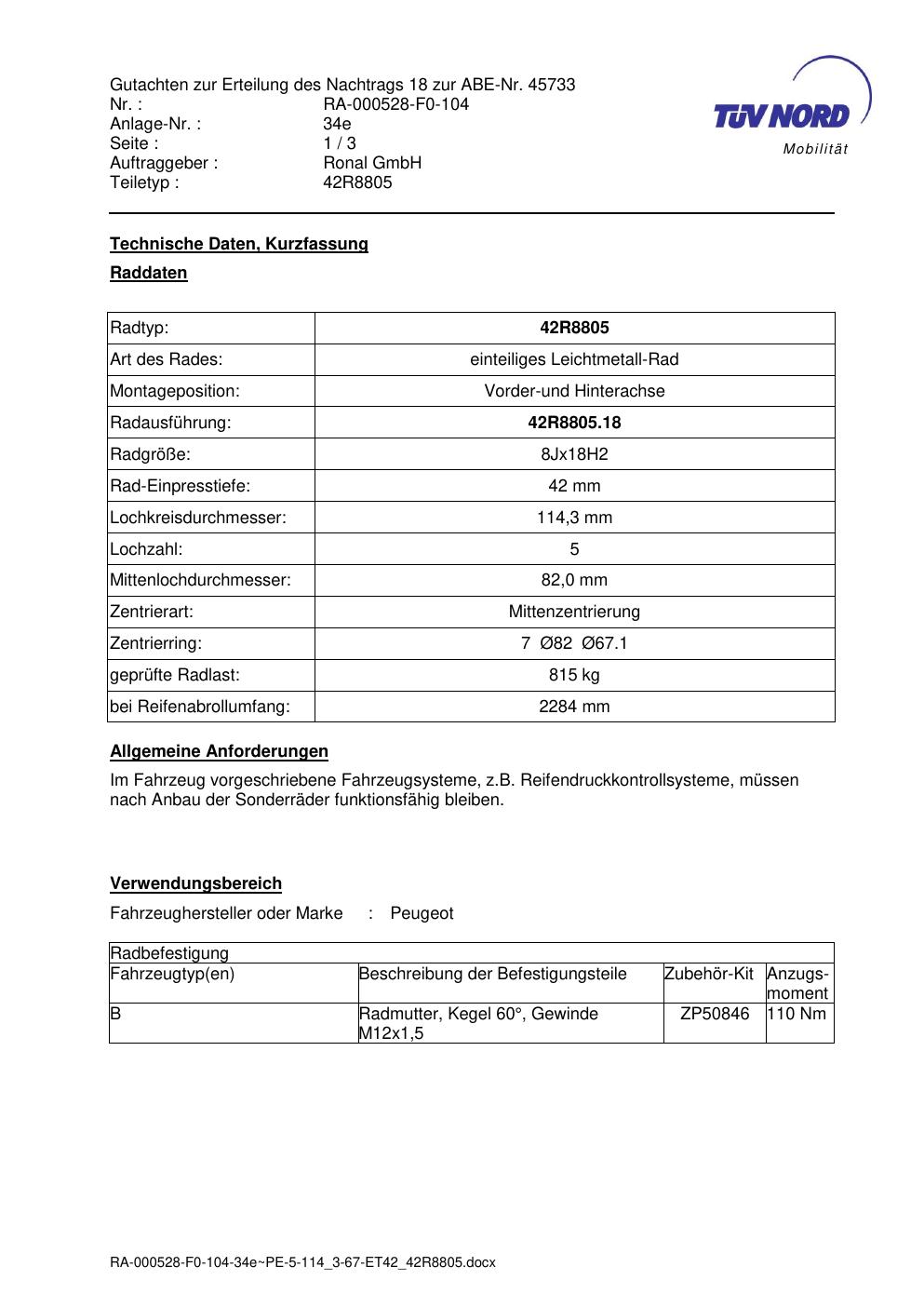 Dieses Gutachten (abe) bezieht sich auf die Alufelge Ronal 42R8805 in der Ausführung 8Jx18 ET 0, Mittenloch 0 mm (KBA 45733). Im PDF findest du typischerweise zulässige Reifengrößen, Auflagen/Anbauhinweise und – je nach Dokument – Hinweise zur Eintragung.