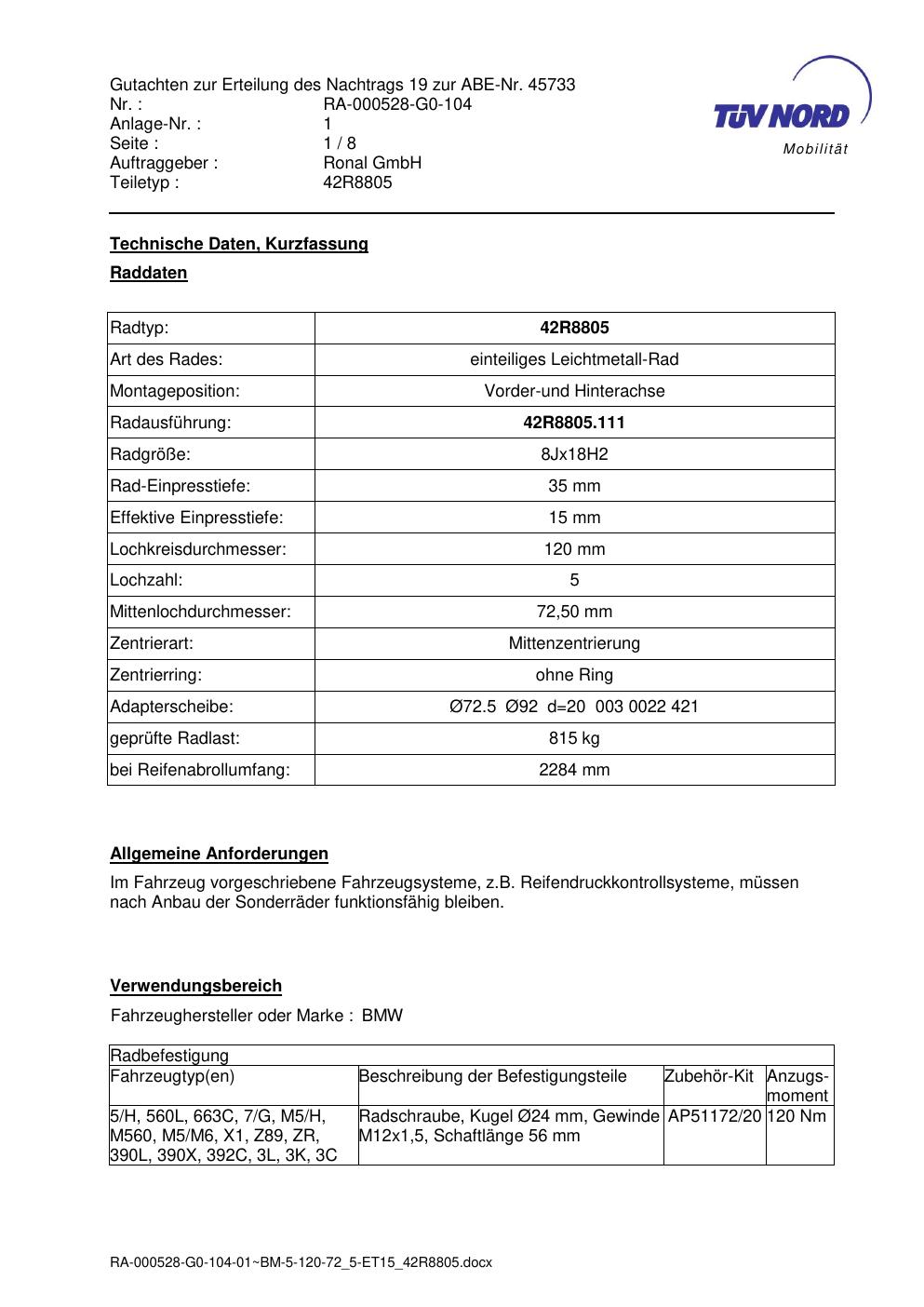 Dieses Gutachten (abe) bezieht sich auf die Alufelge brand-ronal 42R8805 in der Ausführung 8Jx18 ET 0, Mittenloch 0 mm (KBA 45733). Im PDF findest du typischerweise zulässige Reifengrößen, Auflagen/Anbauhinweise und – je nach Dokument – Hinweise zur Eintragung.