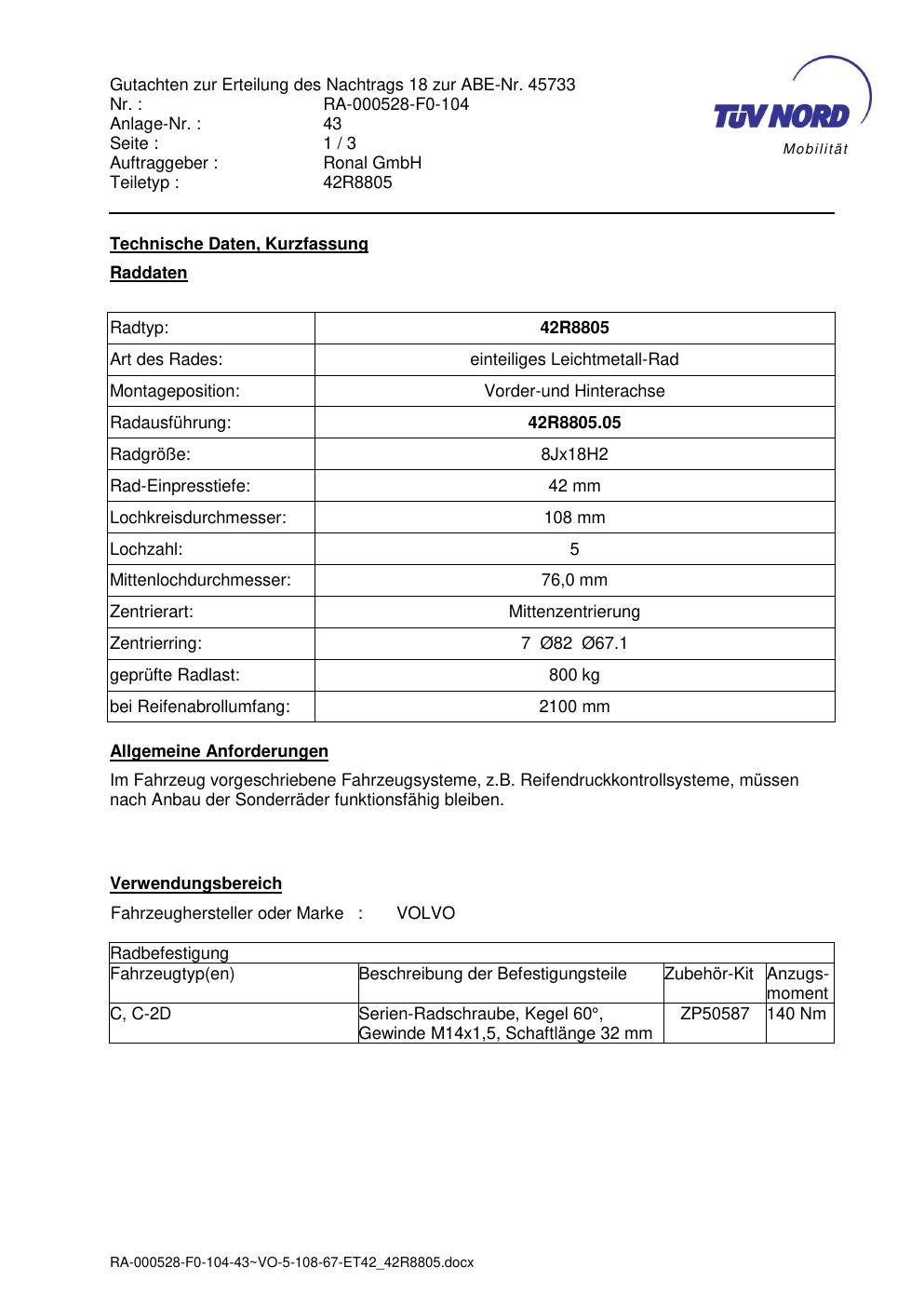 Dieses Gutachten (abe) bezieht sich auf die Alufelge brand-ronal 42R8805 in der Ausführung 8Jx18 ET 0, Mittenloch 0 mm (KBA 45733). Im PDF findest du typischerweise zulässige Reifengrößen, Auflagen/Anbauhinweise und – je nach Dokument – Hinweise zur Eintragung.